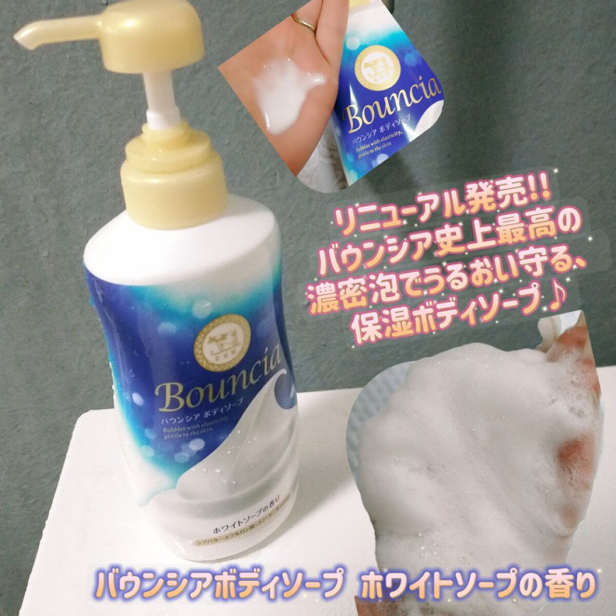 濃密泡にこだわった高保湿ボディソープ バウンシアは、赤箱・青箱でおなじみのメーカー「牛乳石鹸」こだわりのボディソープ𓂃🫧 シアバター・ヒアルロン酸・コラーゲンの入った濃密泡で、肌のうるおいを守り、しっとりなめらかな洗い心地🫧 ͛.* 清潔感のあるフローラルを中心に、あたたかなムスク・アンバーを調和した清楚な香りで気持ちも晴れやかに🫶🏻
