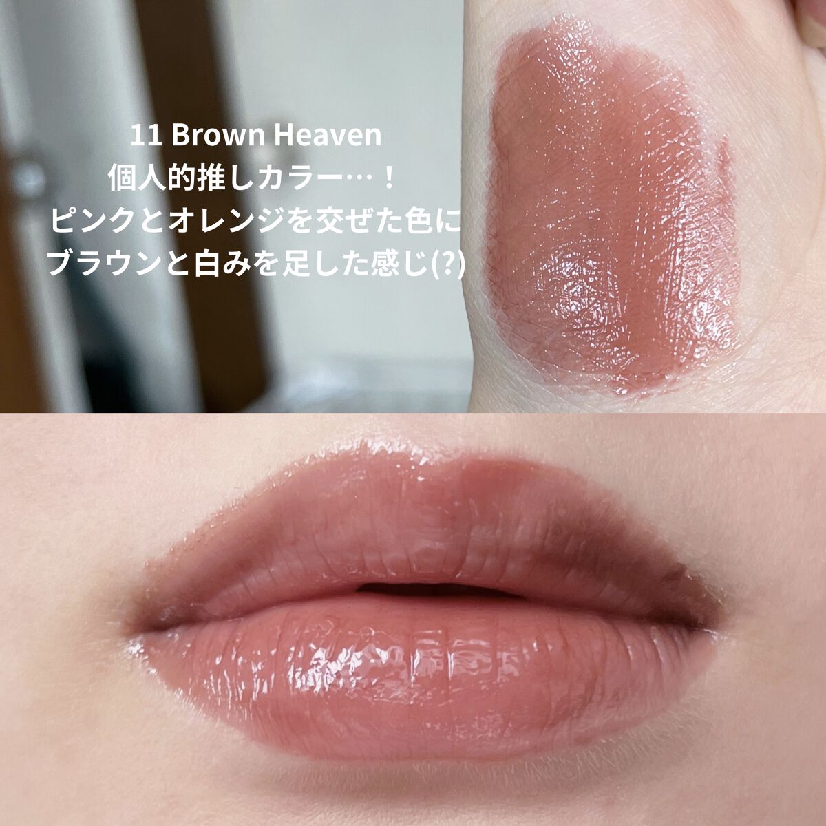 うるうるなんだけど、ぴたっと密着してセミ艶っぽい、むっちりした唇になるのが特徴なティントです✨ 10は特にブルベ夏さんが使いやすそうなくすみ白みピンクカラーで、塗りたては結構明るめに発色します🤍バブみが出るんだけど、トレンドも押さえたオシャレカラーです👶🏻🍼💞 11は推しカラー!こんな色、正直他で見たことないです😮ピンクともオレンジとも言えない、ベージュともブラウンとも言えない、くすみ白み洒落カラーです💟プチプラの発色とは思えない…! 飴玉みたいなころんっとしたパケもかわいいです😉プラじゃなくてガラスかな?