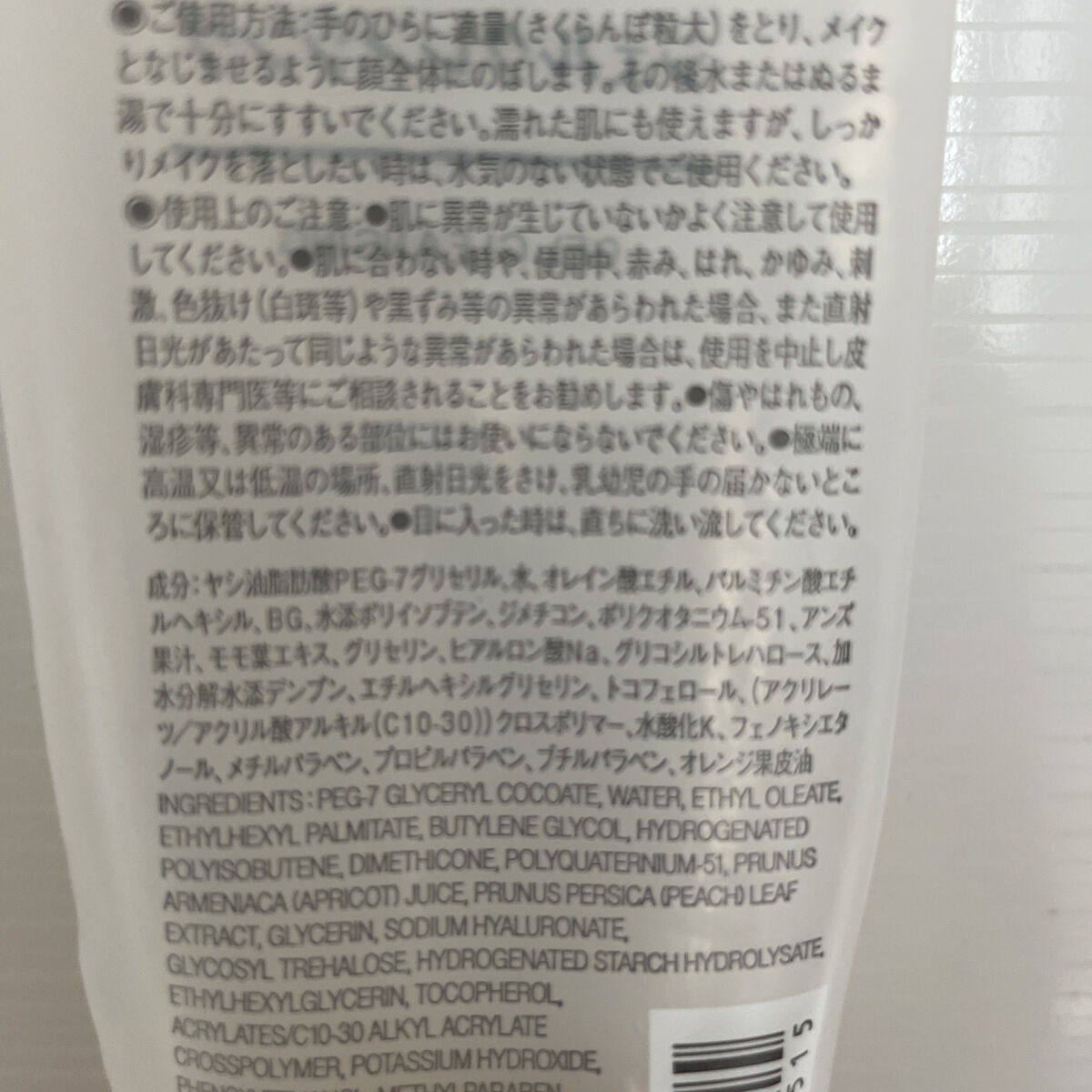 - <30g(携帯用)> ヤシ油脂肪酸PEG-7グリセリル、水、オレイン酸エチル、エチルヘキサン酸セチル、BG、水添ポリイソブテン、ポリクオタニウム-51、アンズ果汁、モモ葉エキス、ヒアルロン酸Na、グリセリン、グリコシルトレハロース、加水分解水添デンプン、ジメチコン、(アクリレーツ/アクリル酸アルキル(C10-30))クロスポリマー、トコフェロール、水酸化K、フェノキシエタノール、メチルパラベン、オレンジ果皮油 <120g> ヤシ油脂肪酸PEG-7グリセリル、水、オレイン酸エチル、エチルヘキサン酸セチル、BG、水添ポリイソブテン、ポリクオタニウム-51、アンズ果汁、モモ葉エキス、ヒアルロン酸Na、グリセリン、グリコシルトレハロース、加水分解水添デンプン、ジメチコン、(アクリレーツ/アクリル酸アルキル(C10-30))クロスポリマー、トコフェロール、水酸化K、フェノキシエタノール、メチルパラベン、オレンジ果皮油 <200g(大容量)> ヤシ油脂肪酸PEG-7グリセリル、水、オレイン酸エチル、エチルヘキサン酸セチル、BG、水添ポリイソブテン、ポリクオタニウム-51、アンズ果汁、モモ葉エキス、ヒアルロン酸Na、グリセリン、グリコシルトレハロース、加水分解水添デンプン、ジメチコン、(アクリレーツ/アクリル酸アルキル(C10-30))クロスポリマー、トコフェロール、水酸化K、フェノキシエタノール、メチルパラベン、オレンジ果皮油