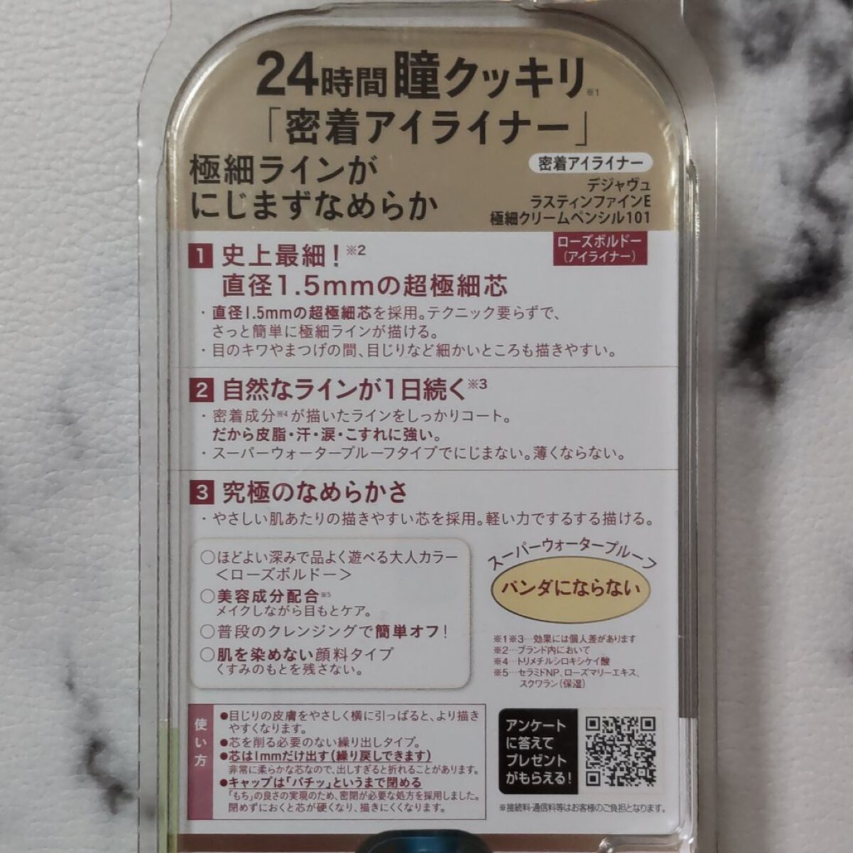 - ”なめらかなのに にじまない”クリームペンシル極細芯タイプ ・史上最細!*直径1.5㎜の超極細芯 ・自然なラインが長時間続く**スーパーウォータープルーフタイプ ・肌当たりが非常にやさしく、なめらかに描ける処方を採用 *ブランド内において **効果には個人差があります