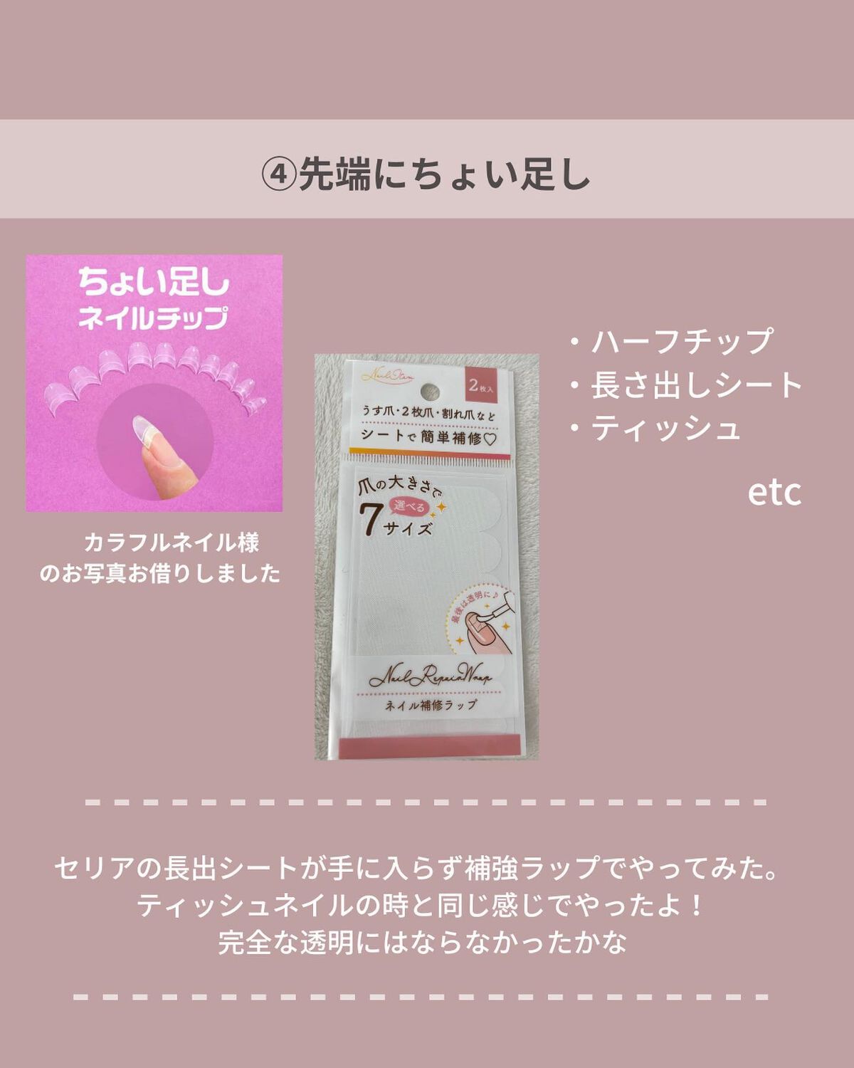 現在の爪トラブル中に活躍アイテムです。 左…人差し指.折れ爪、中指.両サイド亀裂右…中指・薬指.折れ爪◆セリアネイル用長さ出しグラスファイバーシート◆ビューティーネイラービルダージェルクリア◆ネイルフォーム(長さ出し時)◆ネイルファイル100...
