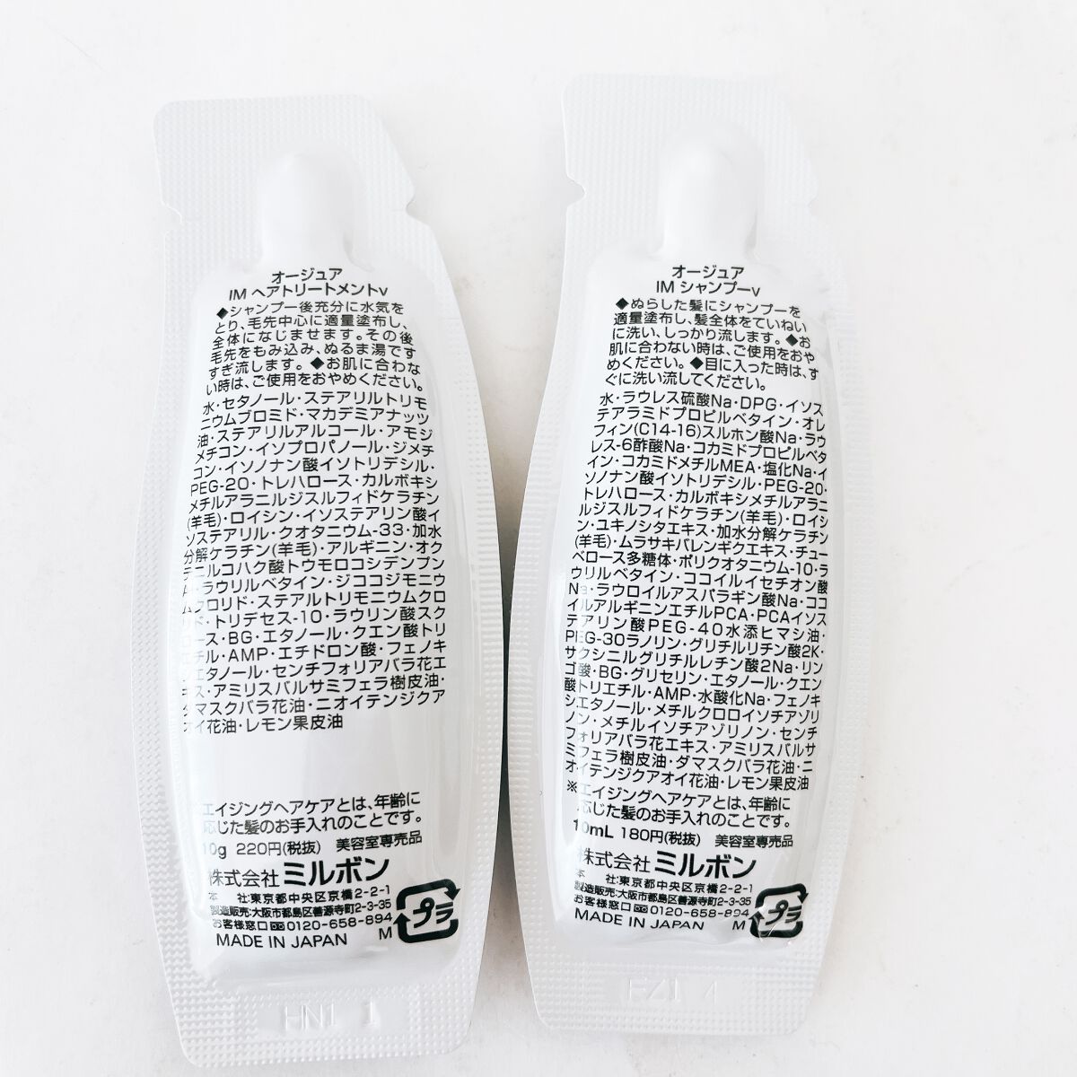 - <シャンプー(500ml)> 水、ラウレス硫酸Na、DPG、イソステアラミドプロピルベタイン、オレフィン(C14-16)スルホン酸Na、ラウレス-6酢酸Na、コカミドプロピルベタイン、コカミドメチルMEA、塩化Na、イソノナン酸イソトリデシル、PEG-20、トレハロース、カルボキシメチルアラニルジスルフィドケラチン(羊毛)、ロイシン、ユキノシタエキス、加水分解ケラチン(羊毛)、ムラサキバレンギクエキス、チューベロース多糖体、ポリクオタニウム-10、ラウリルベタイン、ココイルイセチオン酸Na、ラウロイルアスパラギン酸Na、ココイルアルギニンエチルPCA、PCAイソステアリン酸PEG-40水添ヒマシ油、PEG-30ラノリン、グリチルリチン酸2K、サクシニルグリチルレチン酸2Na、リンゴ酸、BG、グリセリン、エタノール、クエン酸トリエチル、AMP、水酸化Na、フェノキシエタノール、メチルクロロイソチアゾリノン、メチルイソチアゾリノン、センチフォリアバラ花エキス、アミリスバルサミフェラ樹皮油、ダマスクバラ花油、ニオイテンジクアオイ花油、レモン果皮油 <トリートメント(500g)> 水、セタノール、ステアリルトリモニウムブロミド、マカデミアナッツ油、ステアリルアルコール、アモジメチコン、イソプロパノール、ジメチコン、イソノナン酸イソトリデシル、PEG-20、トレハロース、カルボキシメチルアラニルジスルフィドケラチン(羊毛)、ロイシン、イソステアリン酸イソステアリル、クオタニウム-33、加水分解ケラチン(羊毛)、アルギニン、オクテニルコハク酸トウモロコシデンプンAl、ラウリルベタイン、ジココジモニウムクロリド、ステアルトリモニウムクロリド、トリデセス-10、ラウリン酸スクロース、BG、エタノール、クエン酸トリエチル、AMP、エチドロン酸、フェノキシエタノール、センチフォリアバラ花エキス、アミリスバルサミフェラ樹皮油、ダマスクバラ花油、ニオイテンジクアオイ花油、レモン果皮油 <シャンプー(250g)> 水、ラウレス硫酸Na、DPG、イソステアラミドプロピルベタイン、オレフィン(C14-16)スルホン酸Na、ラウレス-6酢酸Na、コカミドプロピルベタイン、コカミドメチルMEA、塩化Na、イソノナン酸イソトリデシル、PEG-20、トレハロース、カルボキシメチルアラニルジスルフィドケラチン(羊毛)、ロイシン、ユキノシタエキス、加水分解ケラチン(羊毛)、ムラサキバレンギクエキス、チューベロース多糖体、ポリクオタニウム-10、ラウリルベタイン、ココイルイセチオン酸Na、ラウロイルアスパラギン酸Na、ココイルアルギニンエチルPCA、PCAイソステアリン酸PEG-40水添ヒマシ油、PEG-30ラノリン、グリチルリチン酸2K、サクシニルグリチルレチン酸2Na、リンゴ酸、BG、グリセリン、エタノール、クエン酸トリエチル、AMP、水酸化Na、フェノキシエタノール、メチルクロロイソチアゾリノン、メチルイソチアゾリノン、センチフォリアバラ花エキス、アミリスバルサミフェラ樹皮油、ダマスクバラ花油、ニオイテンジクアオイ花油、レモン果皮油 <トリートメント(250g)> 水、セタノール、ステアリルトリモニウムブロミド、マカデミアナッツ油、ステアリルアルコール、アモジメチコン、イソプロパノール、ジメチコン、イソノナン酸イソトリデシル、PEG-20、トレハロース、カルボキシメチルアラニルジスルフィドケラチン(羊毛)、ロイシン、イソステアリン酸イソステアリル、クオタニウム-33、加水分解ケラチン(羊毛)、アルギニン、オクテニルコハク酸トウモロコシデンプンAl、ラウリルベタイン、ジココジモニウムクロリド、ステアルトリモニウムクロリド、トリデセス-10、ラウリン酸スクロース、BG、エタノール、クエン酸トリエチル、AMP、エチドロン酸、フェノキシエタノール、センチフォリアバラ花エキス、アミリスバルサミフェラ樹皮油、ダマスクバラ花油、ニオイテンジクアオイ花油、レモン果皮油 <シャンプー詰め替え(1L)> 水、ラウレス硫酸Na、DPG、イソステアラミドプロピルベタイン、オレフィン(C14-16)スルホン酸Na、ラウレス-6酢酸Na、コカミドプロピルベタイン、コカミドメチルMEA、塩化Na、イソノナン酸イソトリデシル、PEG-20、トレハロース、カルボキシメチルアラニルジスルフィドケラチン(羊毛)、ロイシン、ユキノシタエキス、加水分解ケラチン(羊毛)、ムラサキバレンギクエキス、チューベロース多糖体、ポリクオタニウム-10、ラウリルベタイン、ココイルイセチオン酸Na、ラウロイルアスパラギン酸Na、ココイルアルギニンエチルPCA、PCAイソステアリン酸PEG-40水添ヒマシ油、PEG-30ラノリン、グリチルリチン酸2K、サクシニルグリチルレチン酸2Na、リンゴ酸、BG、グリセリン、エタノール、クエン酸トリエチル、AMP、水酸化Na、フェノキシエタノール、メチルクロロイソチアゾリノン、メチルイソチアゾリノン、センチフォリアバラ花エキス、アミリスバルサミフェラ樹皮油、ダマスクバラ花油、ニオイテンジクアオイ花油、レモン果皮油 <トリートメント詰め替え(1L)> 水、セタノール、ステアリルトリモニウムブロミド