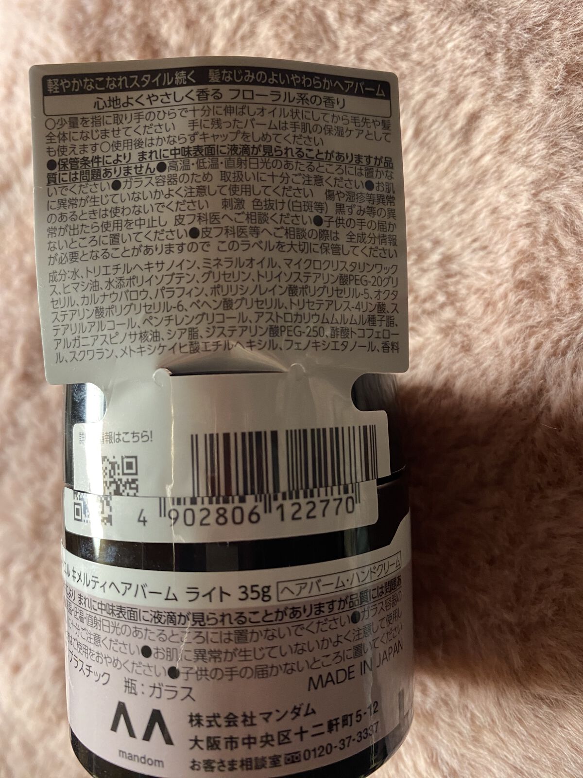 濡れ髪でありながら、綺麗にまとめたい! けどオイルでは軽すぎる、と思っていたのでバームを探していました 香りが良すぎると酔うので、ほのかに香るフローラルは疲れません(◍ ´꒳` ◍) 持ち運びにも丁度いい35㌘サイズ、中も漏れる事もないです✿