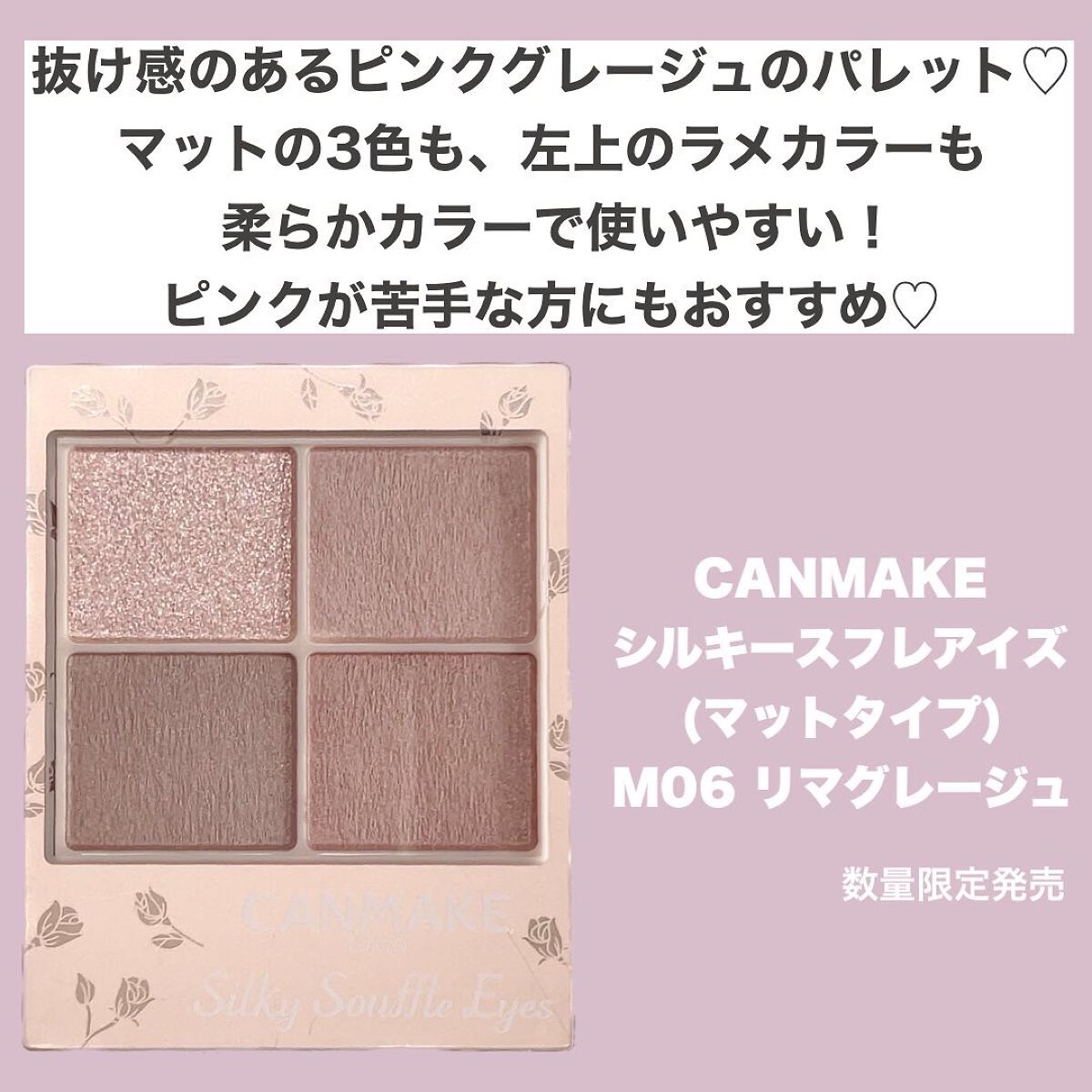 - シルキースフレアイズの姉妹品♡ 肌に溶け込むような透けマットシャドウ 透け感のある柔らかい仕上がりになるマット3色と、透け発色の繊細ラメ1色のパレットシャドウ♡ 完全マットアイや、ラメ×マットアイなど、メイクのパターンを楽しみましょう!