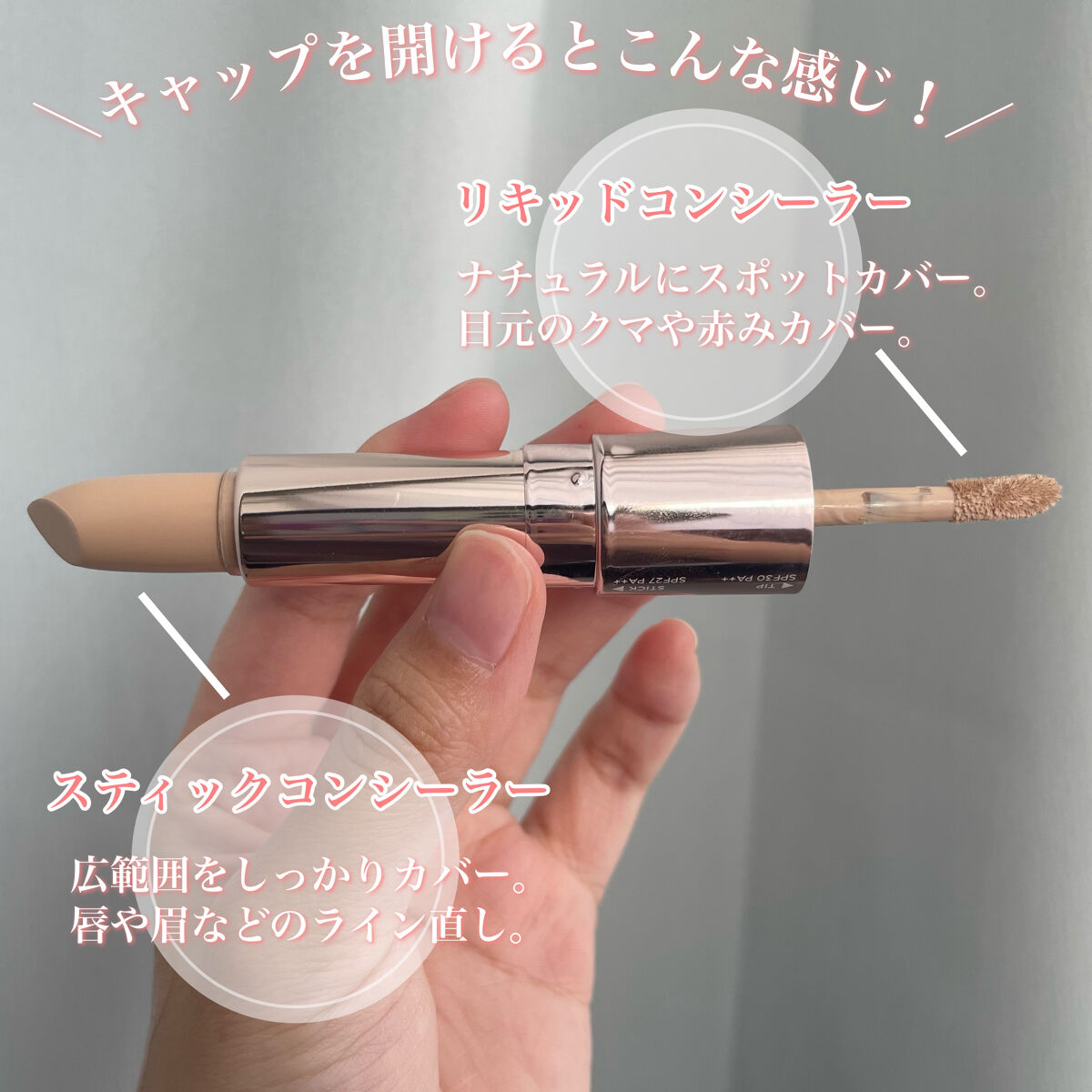 - リキッドとスティック2in1デュアルタイプのコンシーラー。 肌悩みに合わせてテクスチャーを選んで使用することが可能です。 ナチュラルなのに高いカバー力で気になる肌悩みをしっかりカバー。 肌にしっかり密着!ソフトプリズムテクスチャーで素肌のような自然な仕上がり。 UVカット(リキッド:SPF30/PA++ スティック:SPF27/PA++)