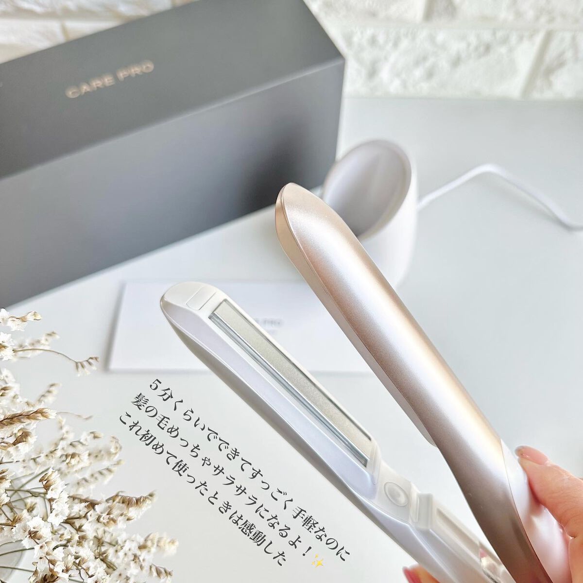 - 超音波アイロンの代表ブランドCARE PROから発売されたホームケア専用品です。ご自宅にいながら、いつものトリートメントでサラサラで艶のある髪質を実現します。 ヘアサロンで使用されているケアプロの「トリートメント浸透促進効果」を搭載し、万が一の水没にも耐える防水機能(IPX7)を搭載。また、サイズをコンパクトにし曲線的なデザインによって、セルフケア時の使い勝手が最適化されています。カラーは高級感を漂わせた、気品のあるエレガントなプラチアホワイトxシルバー。製品としての美しさにも徹底してこだわっています。