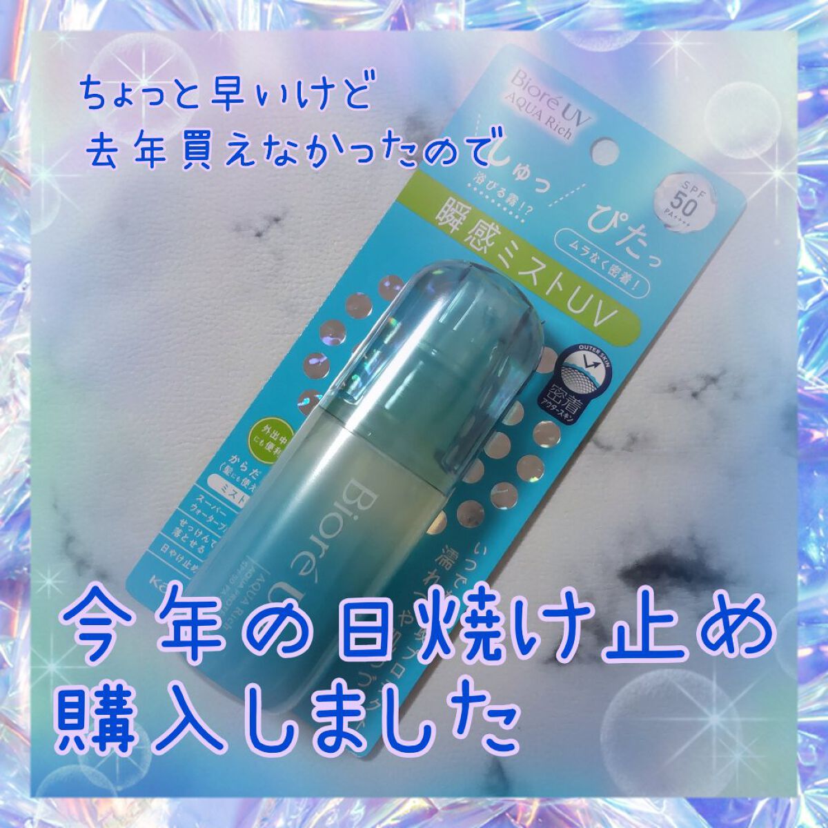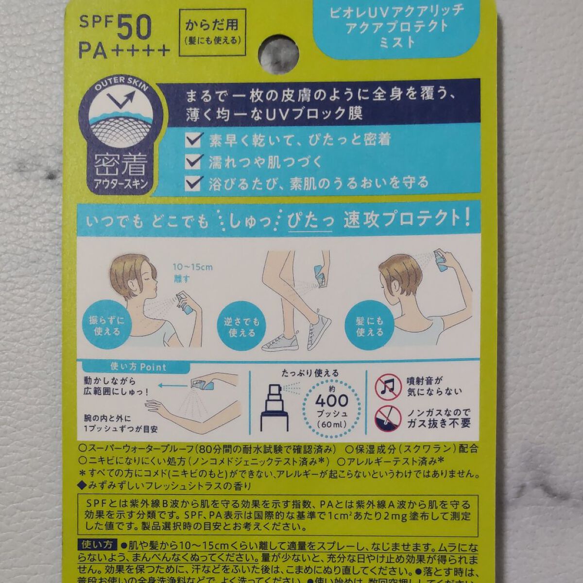 ビオレUVアクアリッチアクアプロテクトミストミストタイプの日焼け止め☀️髪にも使えるし、首や膝裏など塗りにくいところにも使いやすいです♪外出先での塗り直しにも便利!ガスタイプのスプレー缶だと、夏場に暑い中持ち歩くのも怖いし、公共のお手洗いで使...