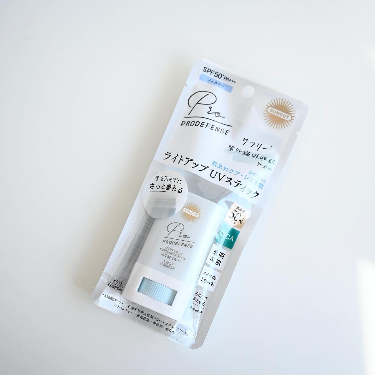 - SPF50+ PA+++ 1.手を汚さずに使える直塗りスティック。さっとひと塗りで素肌を瞬時にライトアップ 2.紫外線吸収剤無添加。7フリー処方※1 3.美容液50%配合※2で、肌あれも日やけによるシミも予防 ※1 紫外線吸収剤フリー・石油系界面活性剤フリー・エチルアルコールフリー・パラベンフリー・無鉱物油・無香料・無着色 ※2 粉体を除く