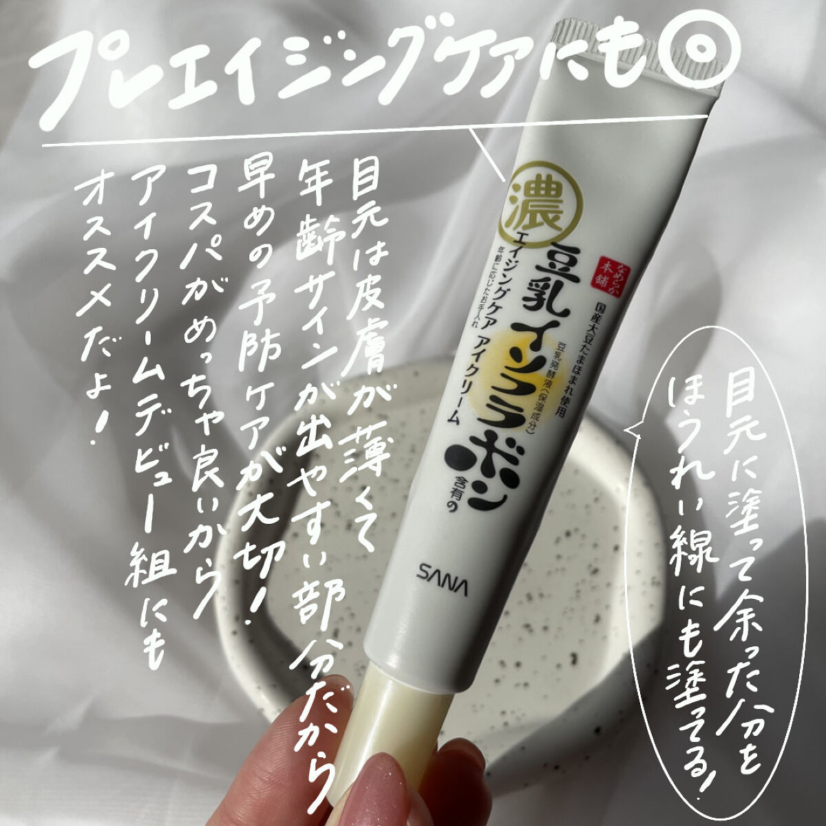 - ピュアレチノール※を新配合!濃厚アイクリームでもっちりハリeyes ※ 保湿成分 「リンクルアイクリーム N」は、『なめらか本舗』オリジナルの豆乳発酵液*1に加え、ピュアレチノール*1とビタミンE誘導体*2を新配合したもっちりとしたハリのある目元に導く「アイクリーム」です。 密着ポリマーがお肌の上で均一な膜を形成し、目元のハリ感をサポート。 毎日のスキンケアに取り入れていただくことで、年齢の出やすい目元をしっかりケアします。 〔①ピュアレチノール*1×豆乳発酵液*1×ビタミンE誘導体*2配合〕 「なめらか本舗」オリジナルのイソフラボン含有の豆乳発酵液*1に加え、ピュアレチノール*1を新配合。 さらに、ビタミンE誘導体(TPNaⓇ)*2も配合し、年齢の出やすい目元をしっかりケアします。 ・ピュアレチノール:ビタミンAの一種でハリのある目元に! ・豆乳発酵液:弾力感・うるおいを与えふっくらした目元に! ・ビタミンE誘導体(TPNaⓇ):お肌にぐんぐん浸透*3してイキイキした目元に! 〔②密着ポリマーで目元にハリ感〕 密着ポリマーがお肌の上で均一な膜を形成します。もっちりとハリのある目元に導きます。 *1 保湿成分 *2 トコフェリルリン酸Na(保湿成分) *3 角層まで