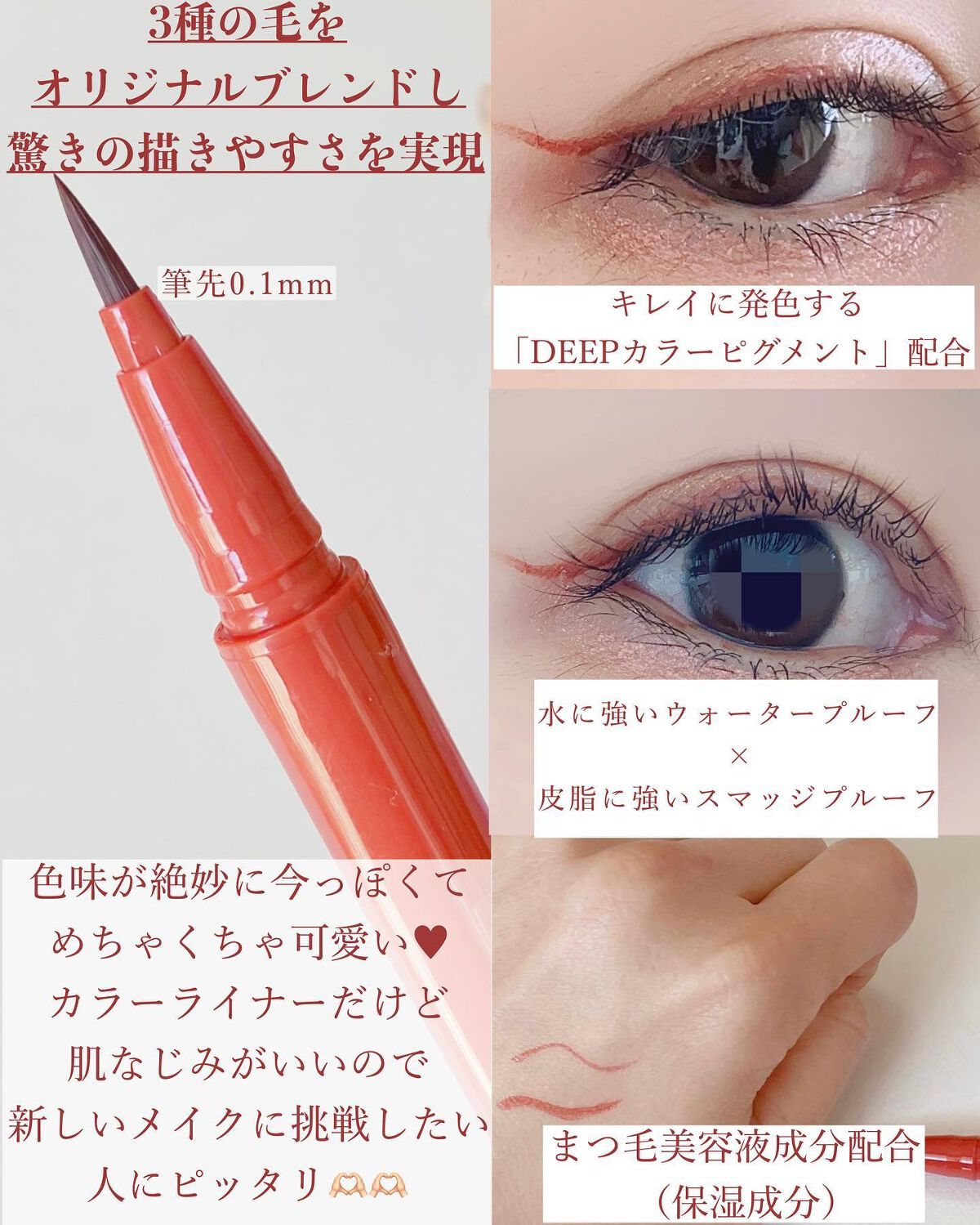 - リニューアル発売 描きやすさを追求した「オリジナル筆」。3種の毛をオリジナルブレンドし、驚きの描きやすさを実現。コシのある極細毛で目尻のハネも綺麗に描ける。鮮やかに発色する「DEEPカラーピグメント」を配合し、瞳をキレイに演出。水に強いウォータープルーフ、皮脂に強いスマッジプルーフのWプルーフ処方。まつ毛のすき間や目尻も描きやすい絶妙なコシのある極細毛。まつ毛美容液成分配合(保湿成分)。イージーオフ・染料不使用。通常のクレンジングでオフできる顔料タイプ。