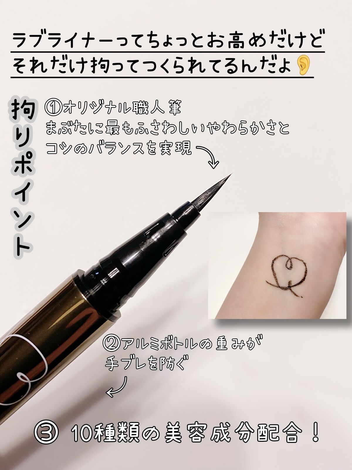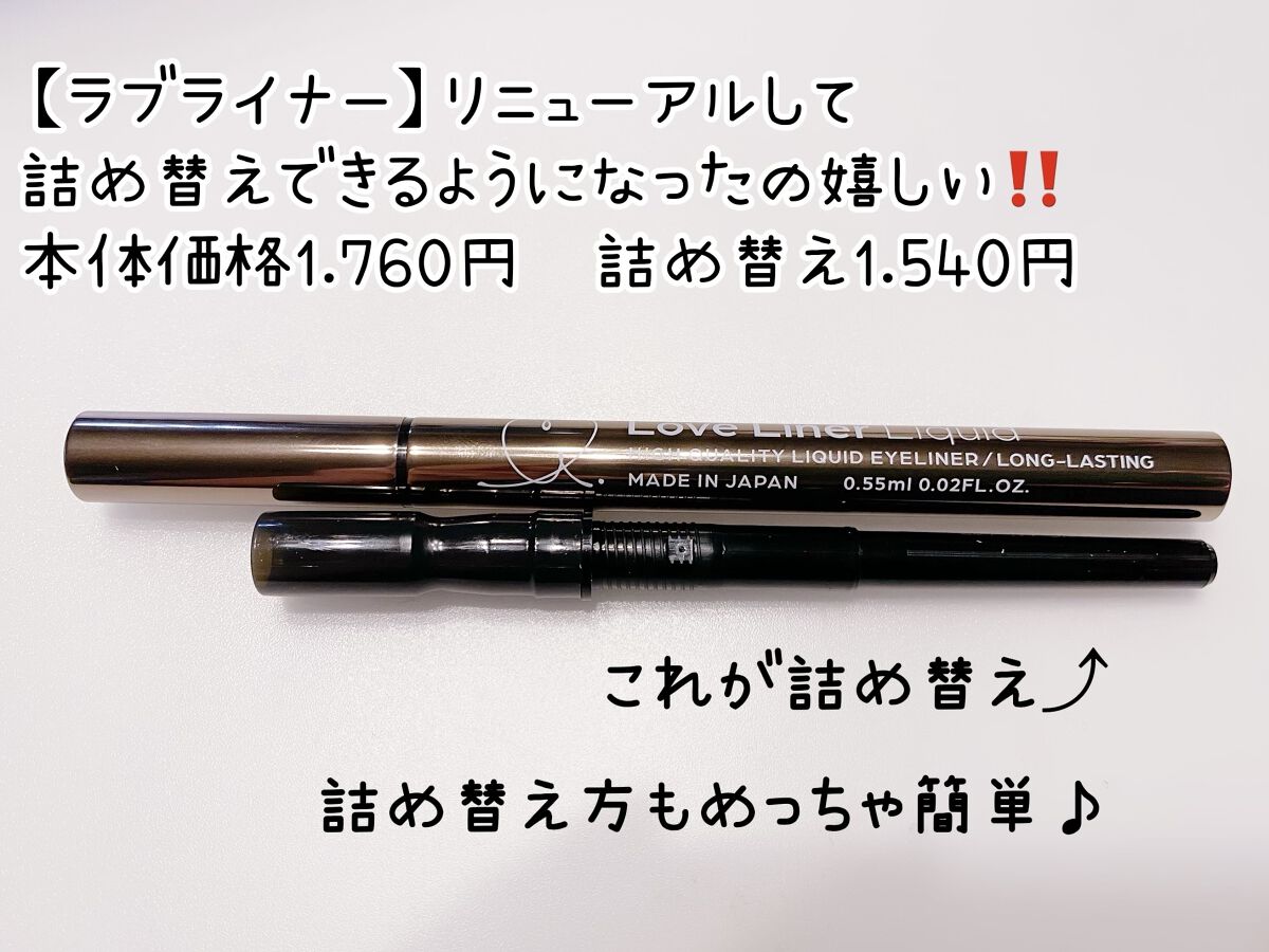 - 「0.1mmの極細毛の筆先」、「手ブレを防ぐ重さのあるアルミボトル」、「ウォータープルーフ&スマッジプルーフ」、「ぬるま湯で簡単オフ」という特長は従来品から引き継ぎ、新たに3つの特長をプラスしました。 1.ラブ・ライナー史上初!つけ替えができて繰り返し使える「リユーザブルボトル」に進化 筆とインクがセットになった専用リフィルをつけ替えることで、お気に入りのボトルを繰り返し使うことができます。 2.ラブ・ライナーだけの黄金比率。職人の手もみブレンドでできたオリジナル職人筆 筆づくり発祥の地、奈良の筆職人の手もみの技によるラブ・ライナーだけのオリジナル職人筆を採用。新素材をラブ・ライナー独自の比率でブレンドし、まぶたに最もふさわしいやわらかさとコシのバランスで、ラブ・ライナー史上最高の描き心地を実現。 3.10種類の美容成分配合※ 従来品に配合していた5種類の美容成分に加え、まつげケアを叶える美容成分を新規配合。合計10種類の美容成分※でメイクするたびに美しい目元へ。 ※保湿成分のこと