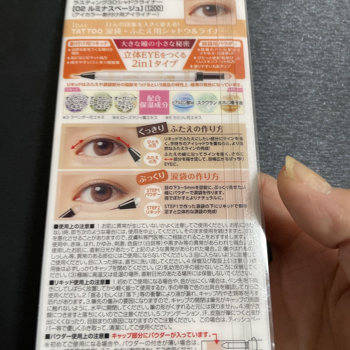 - 涙袋用パウダーと影付け用リキッドが一緒になった2WAYタイプ。 自然な立体感で、目元の印象が大きく変わる! 【涙袋用パウダー】 絶妙なツヤと透け感のあるパウダーで、立体的なぷっくり涙袋が簡単につくれる。 さらにスキンフィット処方で粉飛びしにくく、ぴたっと密着! 綺麗な仕上がりが持続。 【影付け用リキッド】 薄付き発色&マット処方でリアルなふたえライン・涙袋の影が簡単につくれる。 コシあり極細筆で細かいラインも描きやすい! ※配合保湿成分 【パウダー】 ヒアルロン酸Na スクワラン ホホバ種子油 【リキッド】 オーガニックラベンダーエキス オーガニックローズマリーエキス オーガニックカミツレエキス