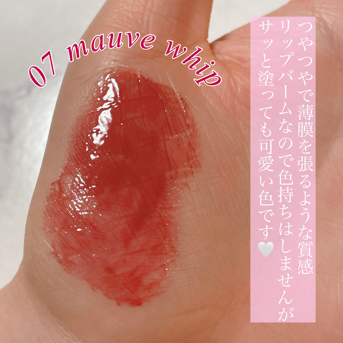 - もちっとした水膜で弾けそうなツヤリップ 1.軽い塗り心地のなめらかで透明な水爆弾ツヤ 2.塗った瞬間から唇を鮮やかに彩る多彩なカラーバーム 3.植物性保湿オイルでしっとりもっちり保湿バーム
