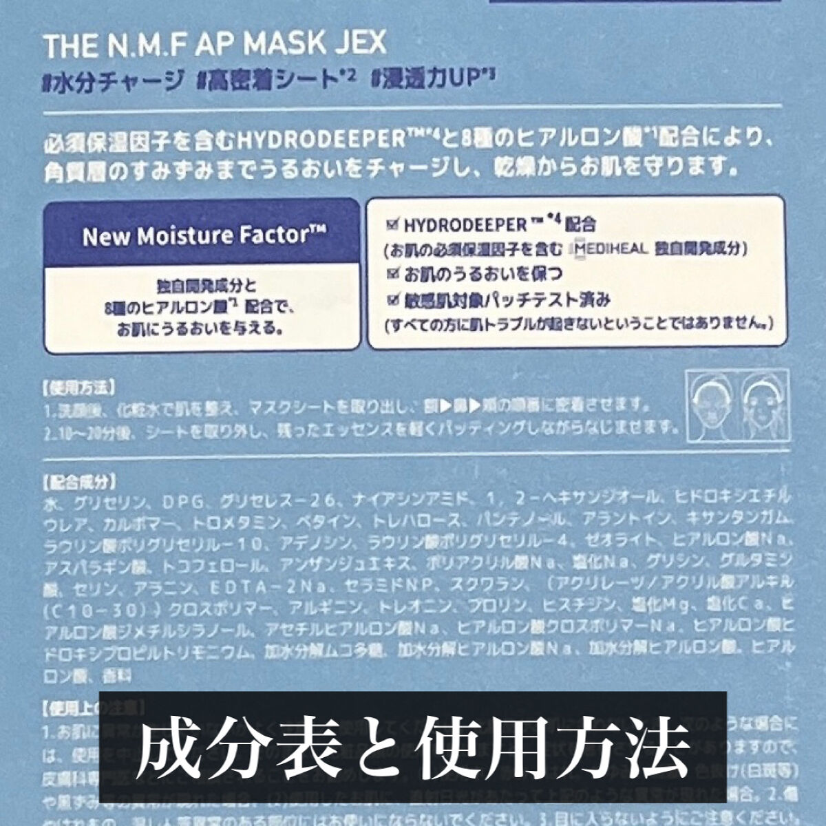 - 必須保湿因子を含む、メディヒール独自開発成分であるHYDRODEEPER™と8種のヒアルロン酸配合により、角質層のすみずみまでうるおいをチャージし、乾燥からお肌を守ります。高密着なシートでお顔の隅々までカバーし、潤いを与えます。