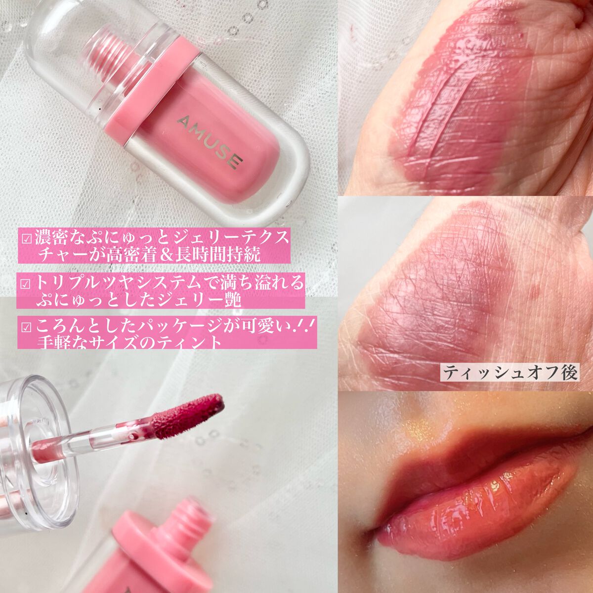 - 濃密なぷにゅっとジェリーが もっちり密着される 長時間持続のジェルフィットティント ☑ぷにゅっとジェリーがもっちり密着される長時間持続&新概念ジェルフィットテクスチャー* ☑8Shadesの透き通るぷにゅっとジェリー発色 ☑3重ツヤシステムで満たせれたぷにゅっとしたジェリーツヤ ☑ジェリーツヤ膜で保湿感ロック ☑手軽いサイズのNEW透明ティント&ぷにゅぷにゅジェリーデザイン ☑ヴィーガン処方 *)AMUSE内において