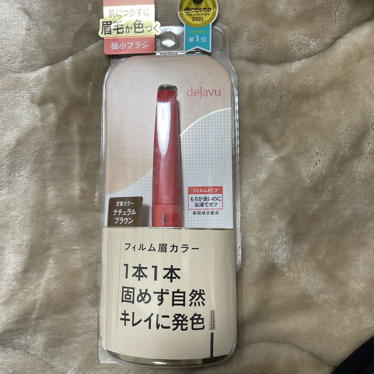 1本1本色づき固まらない「フィルム眉カラー」 塗りやすい極小ブラシで簡単垢抜け✨ デジャヴュ独自の薄膜フィルムを採用。 毛がパリッと固まらず、タバやダマのないふんわり自然な眉に。 フィルムタイプで速乾性が高く、皮脂・汗・こすれに強いのに、お湯だけで簡単に落とせます✨