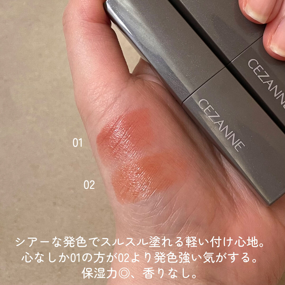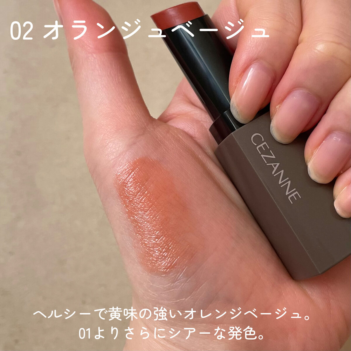 セザンヌリップカラーシールド02オランジュベージュ01フィグブラウンお値段も色合いも普段使いにピッタリ!2color持ってますがどちらも良い色👌02はヘルシーで抜け感のあるオレンジベージュ🍊︎︎︎︎︎︎☑︎色艶を抱えたオイルが、唇の水分と反応...