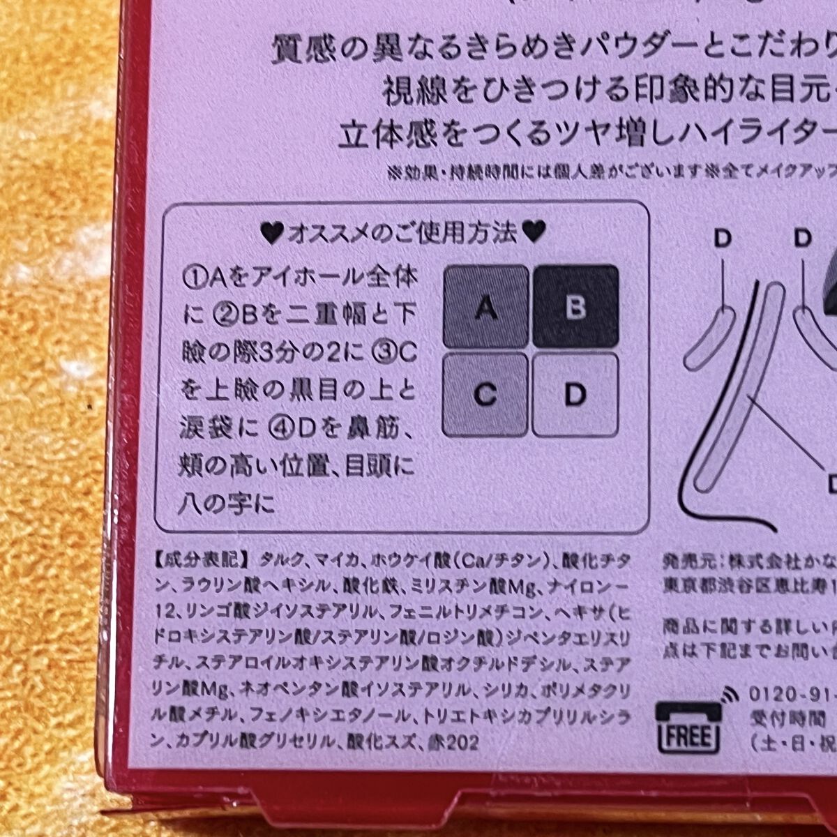 - <08 本気のブラウン> タルク、マイカ、酸化チタン、ホウケイ酸(Ca/チタン)、ホウケイ酸(Ca/Al)、酸化鉄、ポリメタクリル酸メチル、ヘキサ(ヒドロキシステアリン酸/ステアリン酸/ロジン酸)ジペンタエリスリチル、ミリスチン酸Mg、(ジメチコン/ビニルジメチコン)クロスポリマー、ナイロン-12、(フッ化/水酸化/酸化)/(Mg/K/ケイ素)、ラウリン酸ヘキシル、リンゴ酸ジイソステアリル、ステアロイルオキシステアリン酸オクチルドデシル、トリ(カプリル酸/カプリン酸)グリセリル、フェニルトリメチコン、シリカ、窒化ホウ素、ポリプロピレン、ホウケイ酸(Ca/Na)、ラウロイルリシン、ビスジグリセリルポリアシルアジペート-2、ステアリン酸Mg、カプリリルグリコール、ネオペンタン酸イソステアリル、ジメチコン、合成フルオロフロゴパイト、カプリル酸グリセリル、ミリスチン酸イソセチル、グンジョウ、銀、エチルヘキシルグリセリン、水酸化Al、トリエトキシカプリリルシラン、水添レシチン、酸化スズ、ハイドロゲンジメチコン、赤226、水、塩化Na、トコフェロール、硫酸Na <09 再会のピンク> タルク、マイカ、酸化チタン、ホウケイ酸(Ca/チタン)、ラウリン酸ヘキシル、リンゴ酸ジイソステアリル、フェニルトリメチコン、ミリスチン酸Mg、ナイロン-12、酸化鉄、ホウケイ酸(Ca/Al)、ステアロイルオキシステアリン酸オクチルドデシル、ヘキサ(ヒドロキシステアリン酸/ステアリン酸/ロジン酸)ジペンタエリスリチル、ポリメタクリル酸メチル、ビスジグリセリルポリアシルアジペート-2、ポリプロピレン、合成フルオロフロゴパイト、シリカ、ステアリン酸Mg、トリ(カプリル酸/カプリン酸)グリセリル、ポリメチルシルセスキオキサン、ネオペンタン酸イソステアリル、ジメチコン、カプリリルグリコール、トリエトキシカプリリルシラン、カプリル酸グリセリル、(ジメチコン/ビニルジメチコン)クロスポリマー、エチルヘキシルグリセリン、グンジョウ、赤226、水酸化Al、酸化スズ、カルミン、水、塩化Na、硫酸Na、トコフェロール <103 ハッピーエディション【新】> タルク、マイカ、ホウケイ酸(Ca/チタン)、酸化チタン、合成フルオロフロゴパイト、ジメチコン、トリ(カプリル酸/カプリン酸)グリセリル、ポリプロピレン、ポリメタクリル酸メチル、ジフェニルシロキシフェニルトリメチコン、酸化鉄、ヘキサ(ヒドロキシステアリン酸/ステアリン酸/ロジン酸)ジペンタエリスリチル、ビスジグリセリルポリアシルアジペート-2、リンゴ酸ジイソステアリル、ミリスチン酸Mg、(ジメチコン/ビニルジメチコン)クロスポリマー、ダイマージリノール酸(フィトステリル/イソステアリル/セチル/ステアリル/ベヘニル)、フェニルトリメチコン、ダイマージリノール酸ダイマージリノレイルビス(ベヘニル/イソステアリル/フィトステリル)、ジヘプタン酸ネオペンチルグリコール、ホウケイ酸(Ca/Al)、ジエチルヘキサン酸ネオペンチルグリコール、ラウリン酸ヘキシル、ポリイソブテン、ポリメチルシルセスキオキサン、カプリリルグリコール、ポリエチレン、ラウロイルリシン、カプリル酸グリセリル、ステアロイルオキシステアリン酸オクチルドデシル、エチルヘキシルグリセリン、ミリスチン酸イソセチル、酸化スズ、グンジョウ、スオウ樹皮エキス、トリエトキシカプリリルシラン、水添レシチン、カルミン、水酸化Al、赤226、水、トコフェロール、塩化Na、硫酸Na、コチニール等(カルミン) <104 ときめきのポッピンラメ【新】> ホウケイ酸(Ca/Al)、マイカ、タルク、ジヘプタン酸ネオペンチルグリコール、ポリイソブテン、リンゴ酸ジイソ ステアリル、ホウケイ酸(Ca/チタン)、酸化チタン、ポリプロピレン、シリカ、ヘキサ(ヒドロキシステアリン酸/ ステアリン酸/ロジン酸)ジペンタエリスリチル、(ジメチコン/ビニルジメチコン)クロスポリマー、ポリエチレン、酸化鉄、ホウケイ酸(Ca/Na)、合成フルオロフロゴパイト、ポリメタクリル酸メチル、トリ(カプリル酸/カプリ ン酸)グリセリル、ミリスチン酸Mg、ダイマージリノール酸(フィトステリル/イソステアリル/セチル/ステアリ ル/ベヘニル)、ビスジグリセリルポリアシルアジペート-2、カプリリルグリコール、カプリル酸グリセリル、銀、酸化スズ、エチルヘキシルグリセリン、赤226、硫酸Ba、トリエトキシカプリリルシラン、トコフェロール