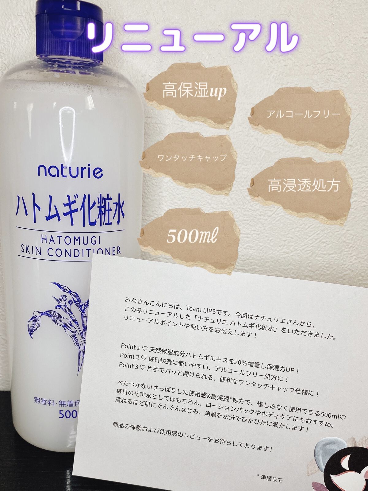 - <通常サイズ 500ml> 水、DPG、BG、グリセリン、ハトムギエキス、グリチルリチン酸2K、(スチレン/VP)コポリマー、クエン酸、クエン酸Na、メチルパラベン <500ml+ 限定ムーミンデザインボトル> 水、DPG、BG、グリセリン、ハトムギエキス、グリチルリチン酸2K、(スチレン/VP)コポリマー、クエン酸、クエン酸Na、メチルパラベン <詰め替えタイプ 480ml> 水、DPG、BG、グリセリン、ハトムギエキス、グリチルリチン酸2K、(スチレン/VP)コポリマー、クエン酸、クエン酸Na、メチルパラベン <旧製品> BG、グリセリン、メチルパラベン、エタノール、グリチルリチン酸2K、ハトムギエキス、DPG、クエン酸Na、プロピルパラベン、クエン酸、(スチレン/アクリレーツ)コポリマー、水 <限定ムーミンデザイン> 水、DPG、BG、グリセリン、ハトムギエキス、グリチルリチン酸2K、(スチレン/VP)コポリマー、クエン酸、クエン酸Na、メチルパラベン