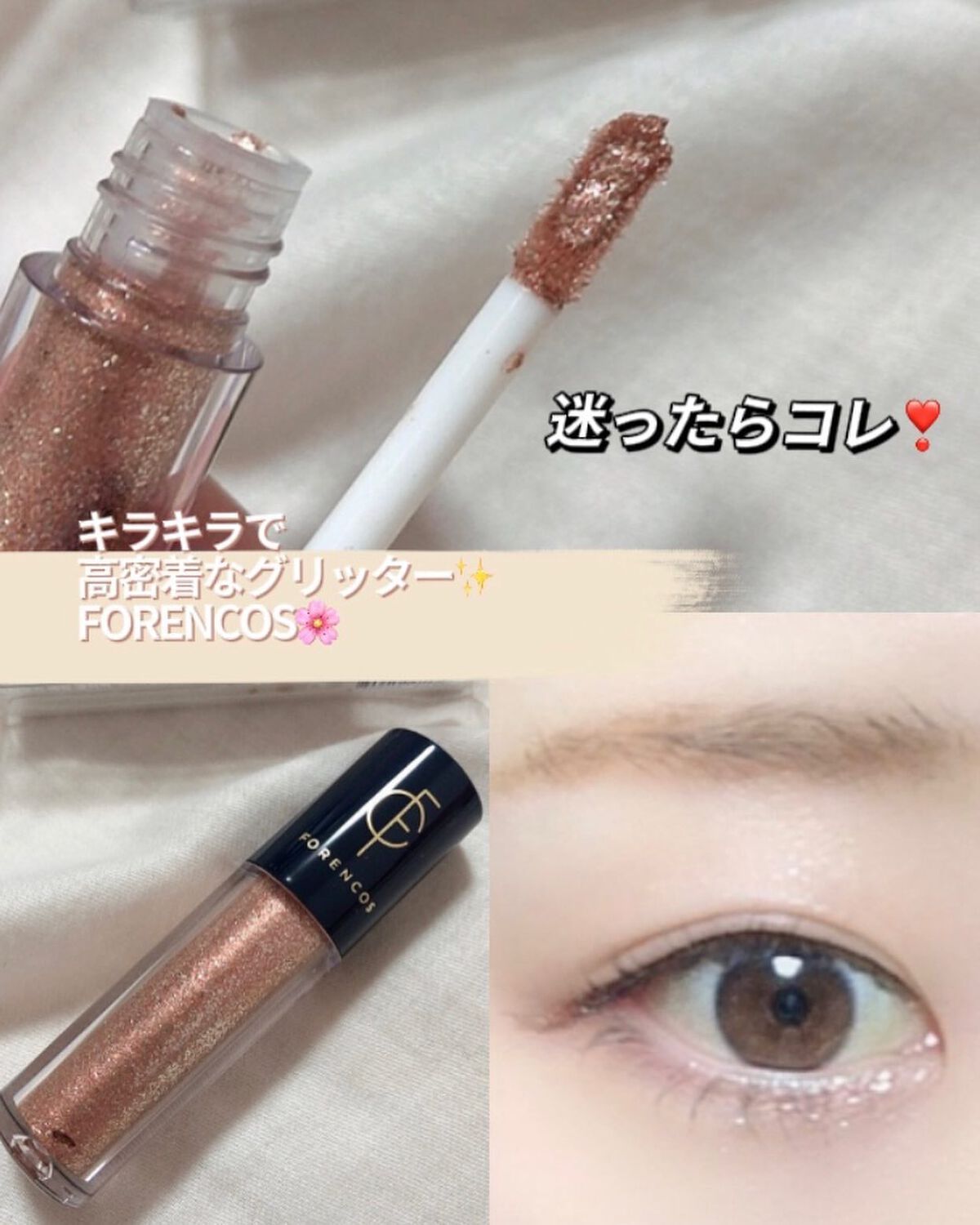 ピンク色に染まるオーロラのようなローズピンクグリッター 高密着グリッター 大粒のラメで華やかな目元に それぞれ違うサイズのラメとクロムグリッターの粒子が角度によってキラキラ輝く ロングラスティングのキラ濡れ感 目に有害な物質を排除し、目のチクチク感がない 分厚く乗せない限りラメ飛びしずらく、乾くと高密着でヨレずらいところが良かったよ🙆♀️◎ フォレンコスのコスメ可愛すぎる♡ チーク狙ってるよ〜🥰