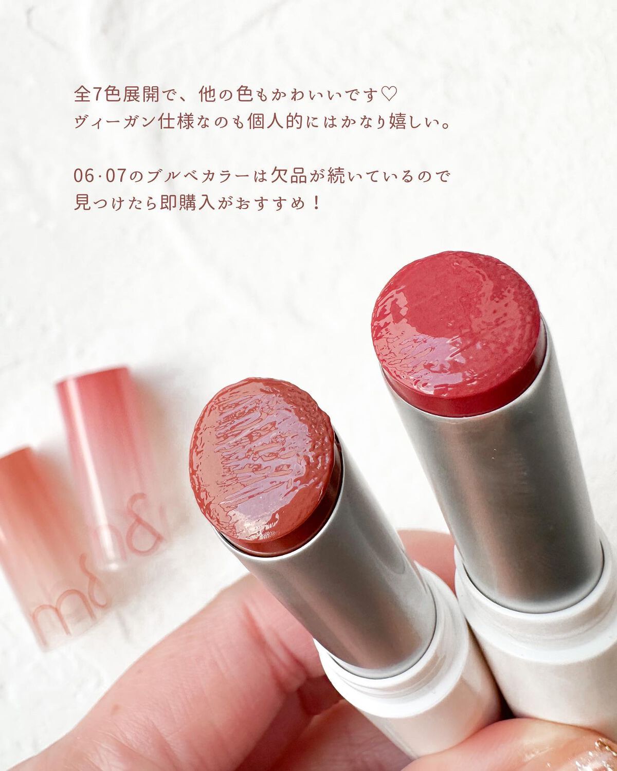 - もちっとした水膜で弾けそうなツヤリップ 1.軽い塗り心地のなめらかで透明な水爆弾ツヤ 2.塗った瞬間から唇を鮮やかに彩る多彩なカラーバーム 3.植物性保湿オイルでしっとりもっちり保湿バーム
