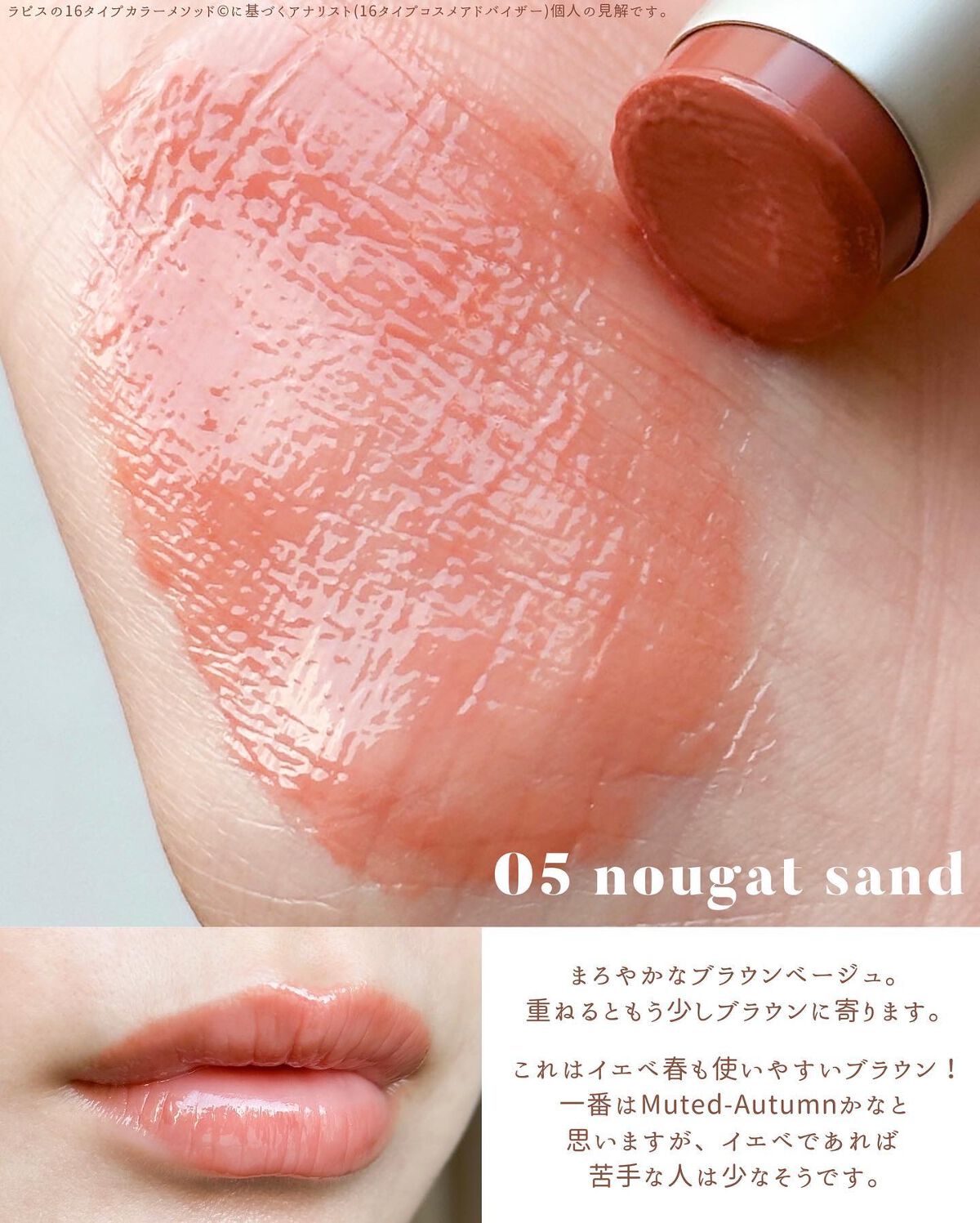 - <01 ココヌード(Coco Nude)> リンゴ酸ジイソステアリル、ダイマージリノール酸ダイマージリノレイルビス(ベヘニル/イソステアリル/フィトステリル)、トリイソステアリン酸ポリグリセリル-2、ビスジグリセリルポリアシルアジペート-2、パラフィン、トリメリト酸トリトリデシル、テトライソステアリン酸ペンタエリスリチル、マイクロクリスタリンワックス、イソステアリン酸ソルビタン、1,2-ヘキサンジオール、ジステアルジモニウムヘクトライト、合成ワックス、酸化チタン、(エチレン/プロピレン)コポリマー、酸化鉄、炭酸プロピレン、香料、赤104(1)、リモネン、リナロール、ホホバ種子油、アーモンド油、アンズ核油、月見草油、オリーブ果実油、アルガニアスピノサ核油、シア脂、ツバキ種子油、トリ(カプリル/カプリン酸)グリセリル、マンゴー果実エキス、カニナバラ果実エキス <02 ラヴィーピンク(Lovey Pink)> リンゴ酸ジイソステアリル、ダイマージリノール酸ダイマージリノレイルビス(ベヘニル/イソステアリル/フィトステリル)、トリイソステアリン酸ポリグリセリル-2、ビスジグリセリルポリアシルアジペート-2、パラフィン、トリメリト酸トリトリデシル、テトライソステアリン酸ペンタエリスリチル、マイクロクリスタリンワックス、イソステアリン酸ソルビタン、1,2-ヘキサンジオール、ジステアルジモニウムヘクトライト、合成ワックス、酸化チタン、(エチレン/プロピレン)コポリマー、赤104(1)、黄5、炭酸プロピレン、赤202、香料、リモネン、リナロール、ホホバ種子油、アーモンド油、アンズ核油、月見草油、オリーブ果実油、アルガニアスピノサ核油、シア脂、ツバキ種子油、トリ(カプリル/カプリン酸)グリセリル、マンゴー果実エキス、カニナバラ果実エキス <03 ソルベバーム(Sorbet Balm)> リンゴ酸ジイソステアリル、ダイマージリノール酸ダイマージリノレイルビス(ベヘニル/イソステアリル/フィトステリル)、トリイソステアリン酸ポリグリセリル-2、ビスジグリセリルポリアシルアジペート-2、パラフィン、トリメリト酸トリトリデシル、テトライソステアリン酸ペンタエリスリチル、マイクロクリスタリンワックス、イソステアリン酸ソルビタン、1,2-ヘキサンジオール、ジステアルジモニウムヘクトライト、合成ワックス、酸化チタン、赤104(1)、(エチレン/プロピレン)コポリマー、酸化鉄、黄5、炭酸プロピレン、香料、リモネン、リナロール、アルガニアスピノサ核油、シア脂、ツバキ種子油、トリ(カプリル/カプリン酸)グリセリル、アーモンド油、アンズ核油、月見草油、オリーブ果実油、ホホバ種子油、マンゴー果実エキス、カニナバラ果実エキス <04 ヒッピーベリー(Hippie Berry)> リンゴ酸ジイソステアリル、ダイマージリノール酸ダイマージリノレイルビス(ベヘニル/イソステアリル/フィトステリル)、トリイソステアリン酸ポリグリセリル-2、ビスジグリセリルポリアシルアジペート-2、パラフィン、トリメリト酸トリトリデシル、テトライソステアリン酸ペンタエリスリチル、マイクロクリスタリンワックス、イソステアリン酸ソルビタン、1,2-ヘキサンジオール、ジステアルジモニウムヘクトライト、合成ワックス、赤104(1)、黄5、(エチレン/プロピレン)コポリマー、赤202、炭酸プロピレン、酸化鉄、酸化チタン、香料、リモネン、リナロール、ホホバ種子油、アーモンド油、アンズ核油、月見草油、オリーブ果実油、アルガニアスピノサ核油、シア脂、ツバキ種子油、トリ(カプリル/カプリン酸)グリセリル、カニナバラ果実エキス、マンゴー果実エキス <05 ヌガーサンド(Nougat Sand)> リンゴ酸ジイソステアリル、ダイマージリノール酸ダイマージリノレイルビス(ベヘニル/イソステアリル/フィトステリル)、トリイソステアリン酸ポリグリセリル-2、ビスジグリセリルポリアシルアジペート-2、パラフィン、トリメリト酸トリトリデシル、テトライソステアリン酸ペンタエリスリチル、マイクロクリスタリンワックス、イソステアリン酸ソルビタン、酸化チタン、1,2-ヘキサンジオール、ジステアルジモニウムヘクトライト、合成ワックス、黄4、(エチレン/プロピレン)コポリマー、酸化鉄、炭酸プロピレン、赤202、香料、リモネン、青1、リナロール、シア脂、ツバキ種子油、トリ(カプリル/カプリン酸)グリセリル、アルガニアスピノサ核油、ホホバ種子油、アーモンド油、アンズ核油、月見草油、オリーブ果実油、マンゴー果実エキス、カニナバラ果実エキス <06 カヤフィグ(Kaya Fig)> リンゴ酸ジイソステアリル、ダイマージリノール酸ダイマージリノレイルビス(ベヘニル/イソステアリル/フィトステリル)、トリイソステアリン酸ポリグリセリル-2、ビスジグリセリルポリアシルアジペート-2、パラフィン、トリメリト酸トリトリデシル、テトライソステアリン酸ペンタエリスリチル、マイクロクリスタリンワックス、イソステアリン酸ソルビタン、1,2-ヘキサンジオール、酸化チタン、ジステアルジモニウムヘク