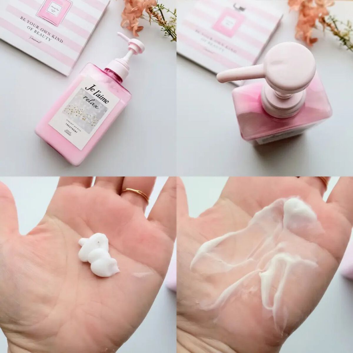 可愛らしい、韓国コスメ風くすみピンク&ベージュパッケージが一際目立つ♡ 毛流れを整え、ツヤ感や手触りを補整するシャンプー&コンディショナー✨ シャンプーは、ピンク色のパッケージです🤭手のひらに出してみると とろりとしたテクスチャで香りは、 フローラルリュクスの華やかな香り。 髪の毛に馴染ませると柔らかい泡立ちで 気持ちよく洗い上げることができます。 コンディショナーは、やや硬めの テクスチャで香りはシャンプーと 同様です。 11種のアミノ酸成分配合(補修:アルギニン、アスパラギン酸、グリシン、アラニン、セリン、バリン、イソロイシン、プロリン、トレオニン、ヒスチジン、フェニルアラニン)です。 髪の毛のごわつきや広がりが 気になる私ですがこちらのヘアケアを 使用してみてうるサラが実感。 ドライヤーで乾かしたあとも 香りがふわっとするので気分も上がる♡