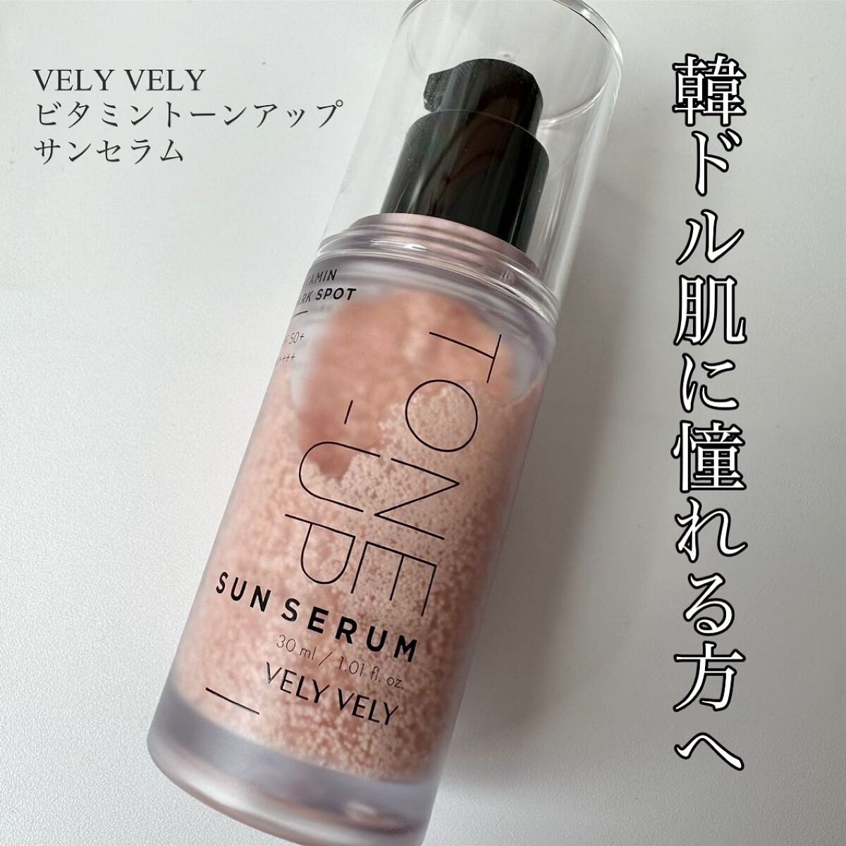 ☑VELYVELYビタミントーンアップサンセラム使って驚き!!めちゃくちゃ気に入った!みずみずしいテクスチャから伸ばしなじませるとぴたぁっと密着して艶、トーンアップ!しかも1日中くすみ知らず!!夕方ファンデのくすみが気になる時もこれを下地に仕...