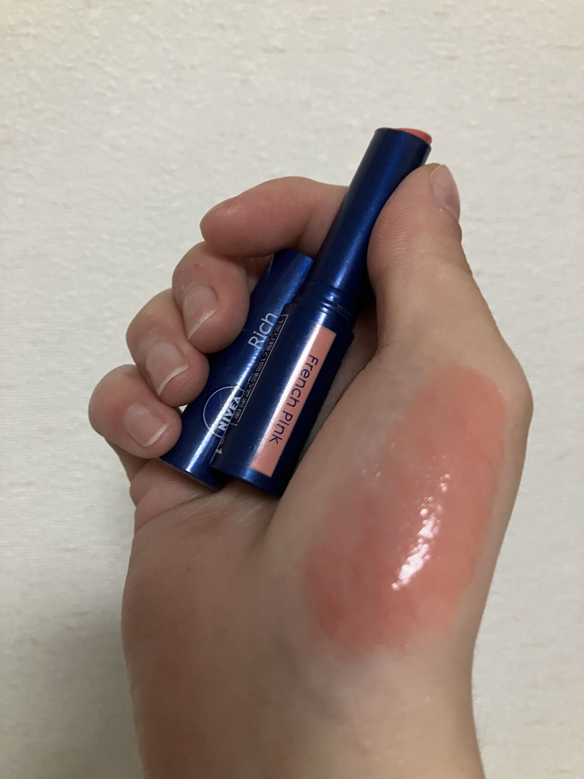 【塗り直しリップの最適解♡】ニベアリッチケア&カラーリップフレンチピンク万人ウケ間違いなしの柔らか桃ピンク。顔色をパッと明るく、唇のくすみも取り去ってくれる、明るめのお色味です。保湿リップのような質感で、潤いが長続きします。色味もほんのりとだ...