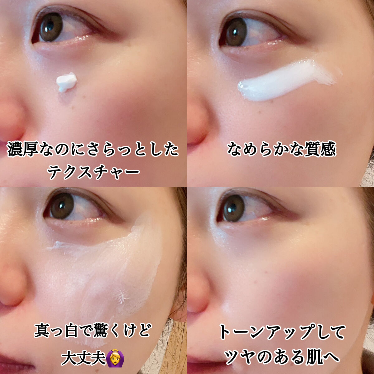 肌にうるおいを与え、明るい肌印象へ。肌をなめらかにし、なじませた直後からツヤのあるお肌へ導いてくれるそう。 目元だけでなく顔全体にも使えるとのこと。 こちらはそれよりもこってりとした印象ですが、なめらかに塗れてベタつかず、アイクリームの独特のペタペタ感がなくて使いやすく感じました。