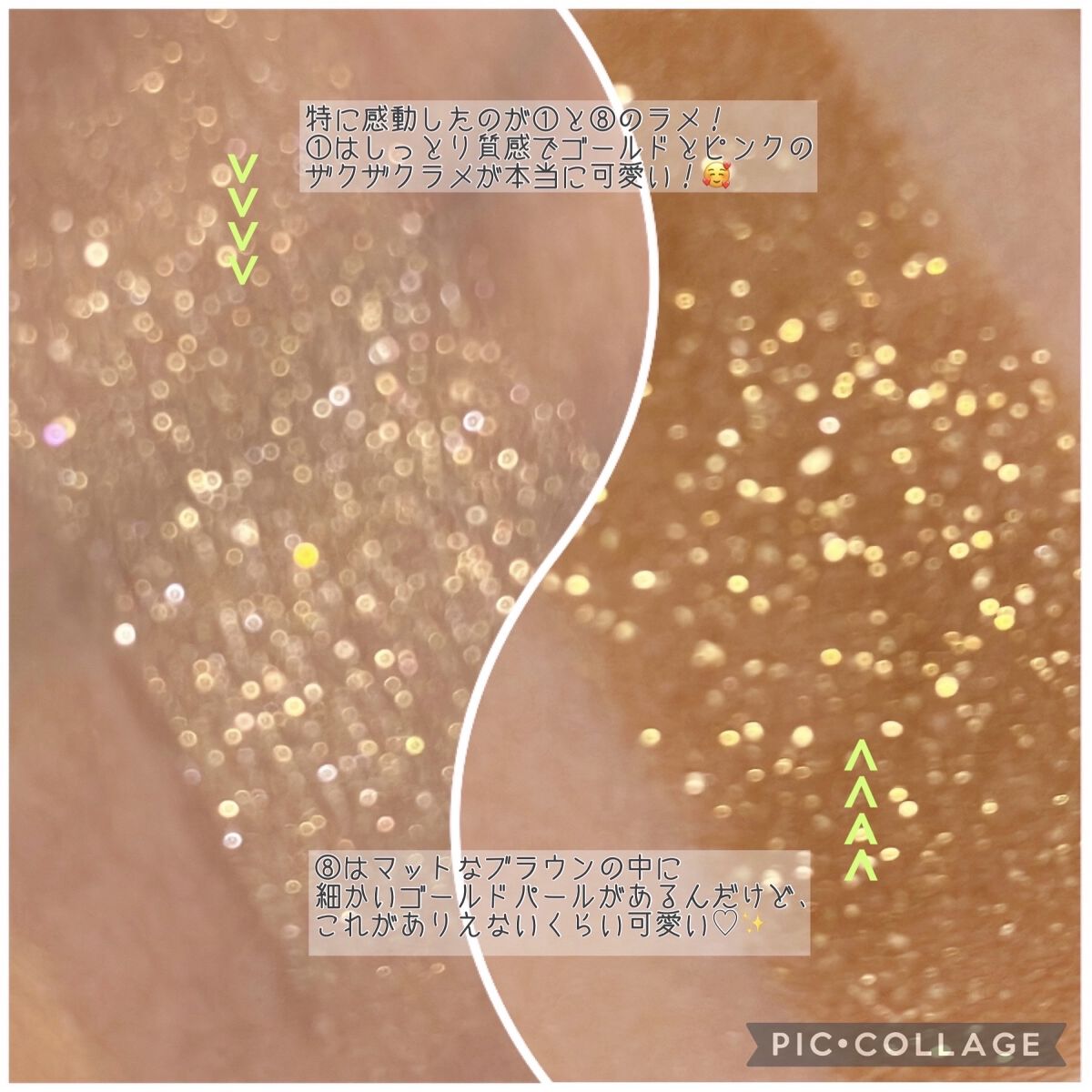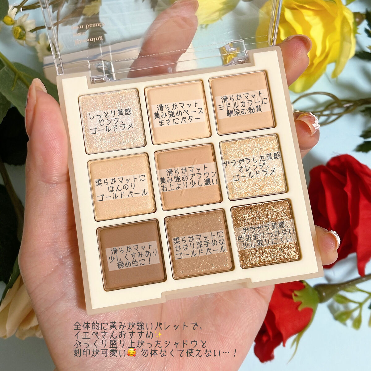 マットはかなりくすんだ色で、暗めのメイクに仕上がりがちに🤎 ツヤ感が大事だと言われるイエベ春でも、スモーキーメイク出来るんだ…!と思わせてくれたパレット。 愛して止まないミルクラテ、絶妙な柔らかベージュに透明感たっぷりのラメ✨️ 全色ラメ入りですが、真ん中2色のくすみと黄みが強く、どんよりした目元に…🥲 コーラルは大好きなんですが、このパレットは3滴白みを足したような色で、発色も弱くまぶたにも乗りづらく、かなり色白さんでないと使えない気がします…🥲 手持ちの中で1番黄み強いですが、1番完成度の高いです💕