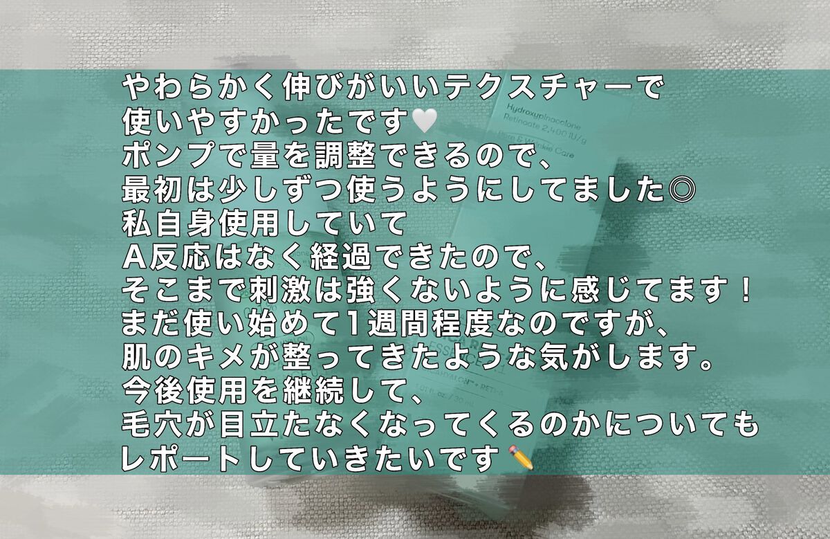 - こだわり成分配合◎パッケージにもこだわりをプラス♪ ●パッケージのポイント! エアレス容器でレチノール成分*を守り、鮮度の高い成分をそのまま肌へ届けます。 心地よく馴染み肌のキメを整える - 水分たっぷりの使用感でべたつきにくい! - しっとり肌の角質層隅々まで馴染み肌のキメが整った美肌に導いてくれます。 *整肌成分 使用方法 ◎ STEP1. エンドウ豆ほどに手に取り、気になる部分や顔全体に塗り広げます。