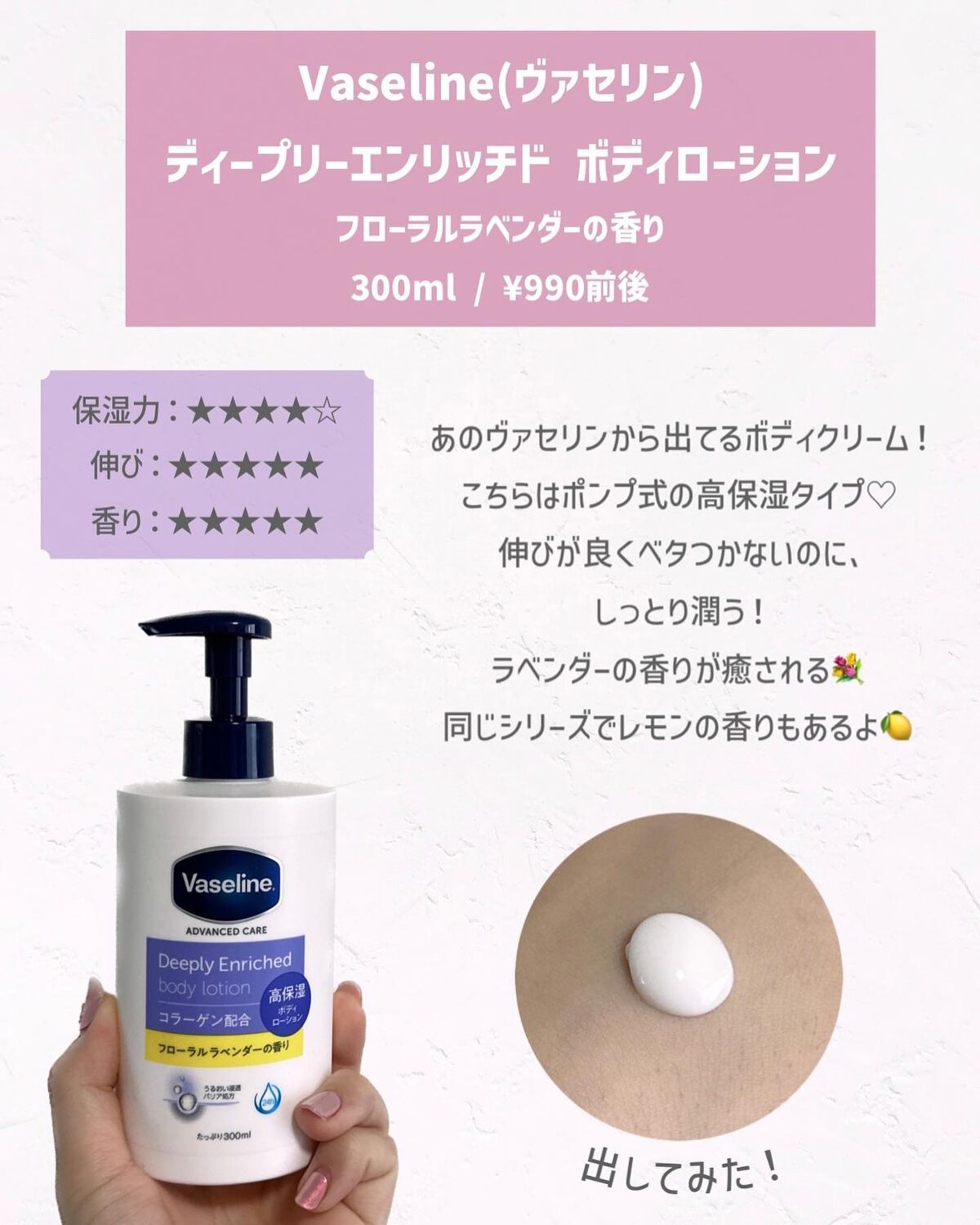ヴァセリン ディープリーエンリッチド ボディローション フローラルラベンダーの香り | 990円 |