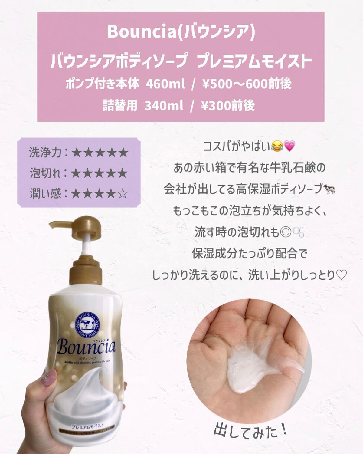 | 泡がしっとりなめらか濃密!! なのに泡切れも良くさらっと流れせてぬるつきも残らないのがうれしいポイントです♬ | 詳細を見る | |