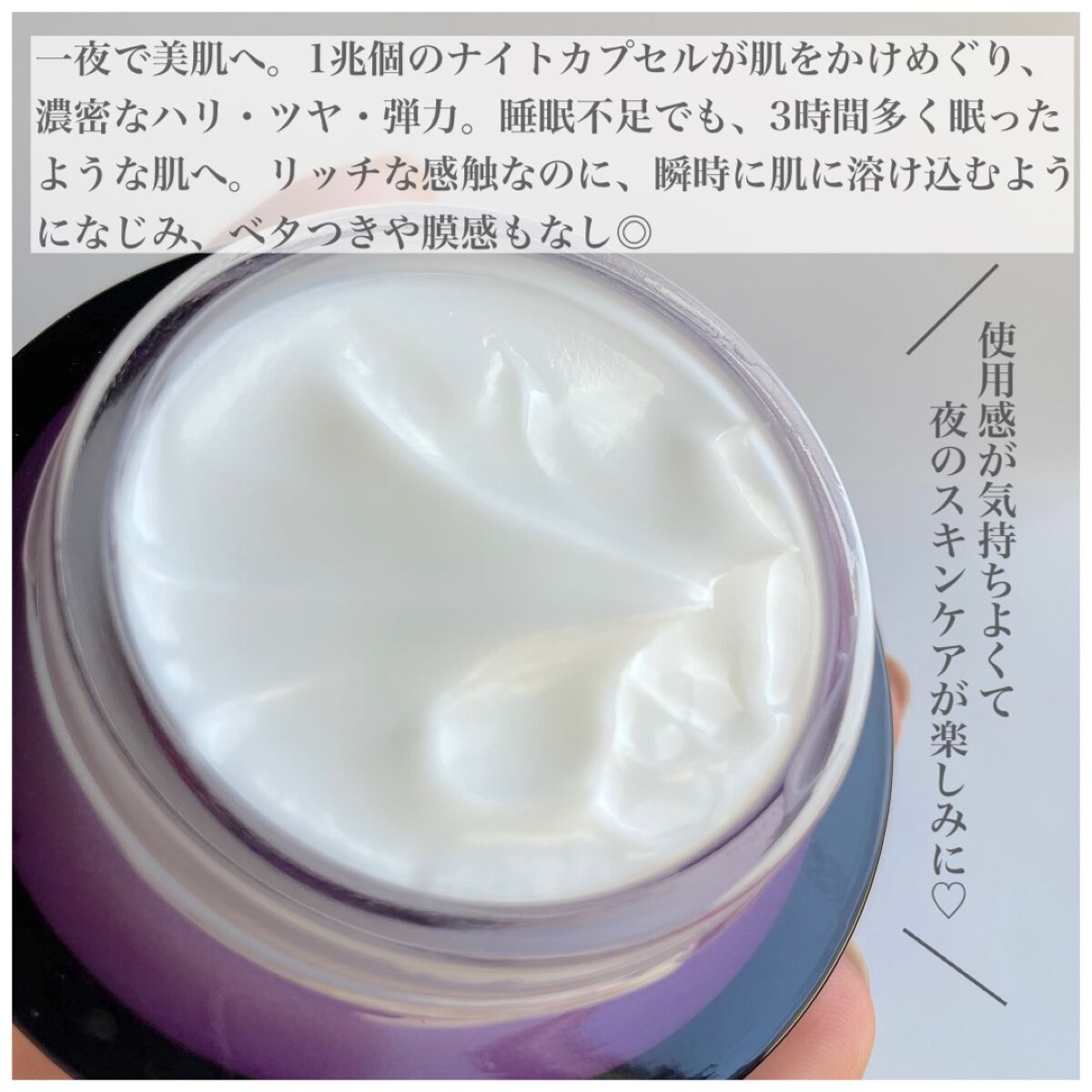 1兆個のナイトカプセルが肌をかけめぐり、濃密なハリ・ツヤ・弾力を与える 『睡眠不足でも3時間多く眠ったような肌へ』 テクスチャーは柔らかめで伸びもよく肌にスッと馴染みます!