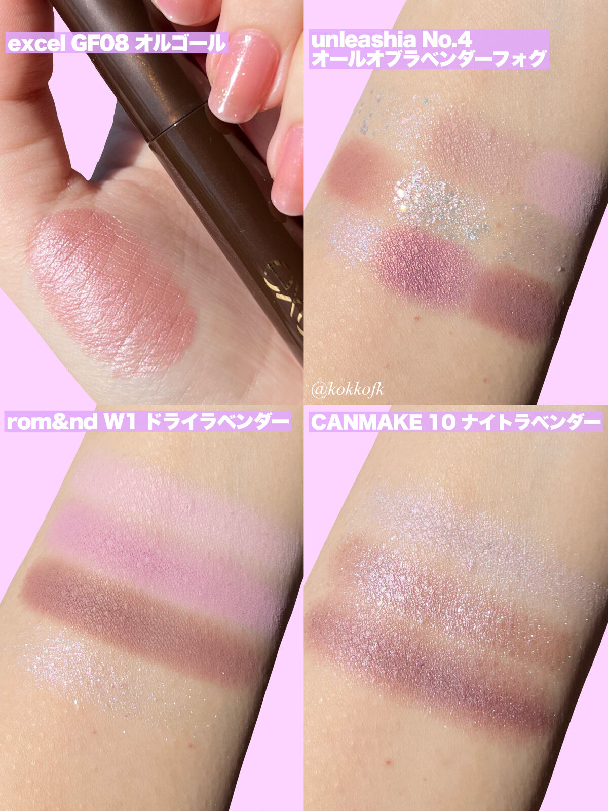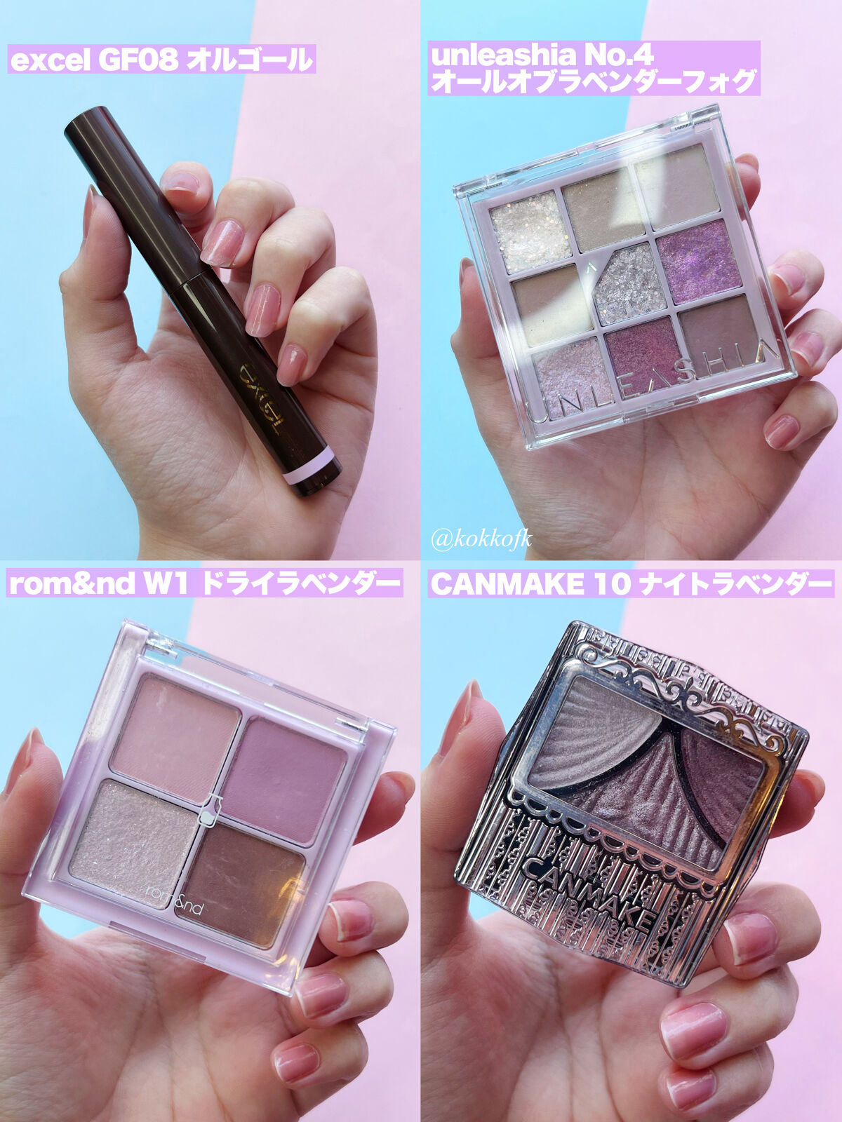 W デイリームードアップパレット01 ソフトモーブピンク (¥2420) プロ アイ パレット13 PICNIC BY THE SUNSET, グラムチェンジマルチパレット04 ユニコーンピンク (¥1890) グリッターぺディアアイパレットN°4 オールラベンダーフォグ (¥2950) シャドウパレット16 バイオレットニット (¥3610) ベターザンパレット06 PEONY NUDE GARDEN, 09 DREAMY LILAC GARDEN (¥2900)