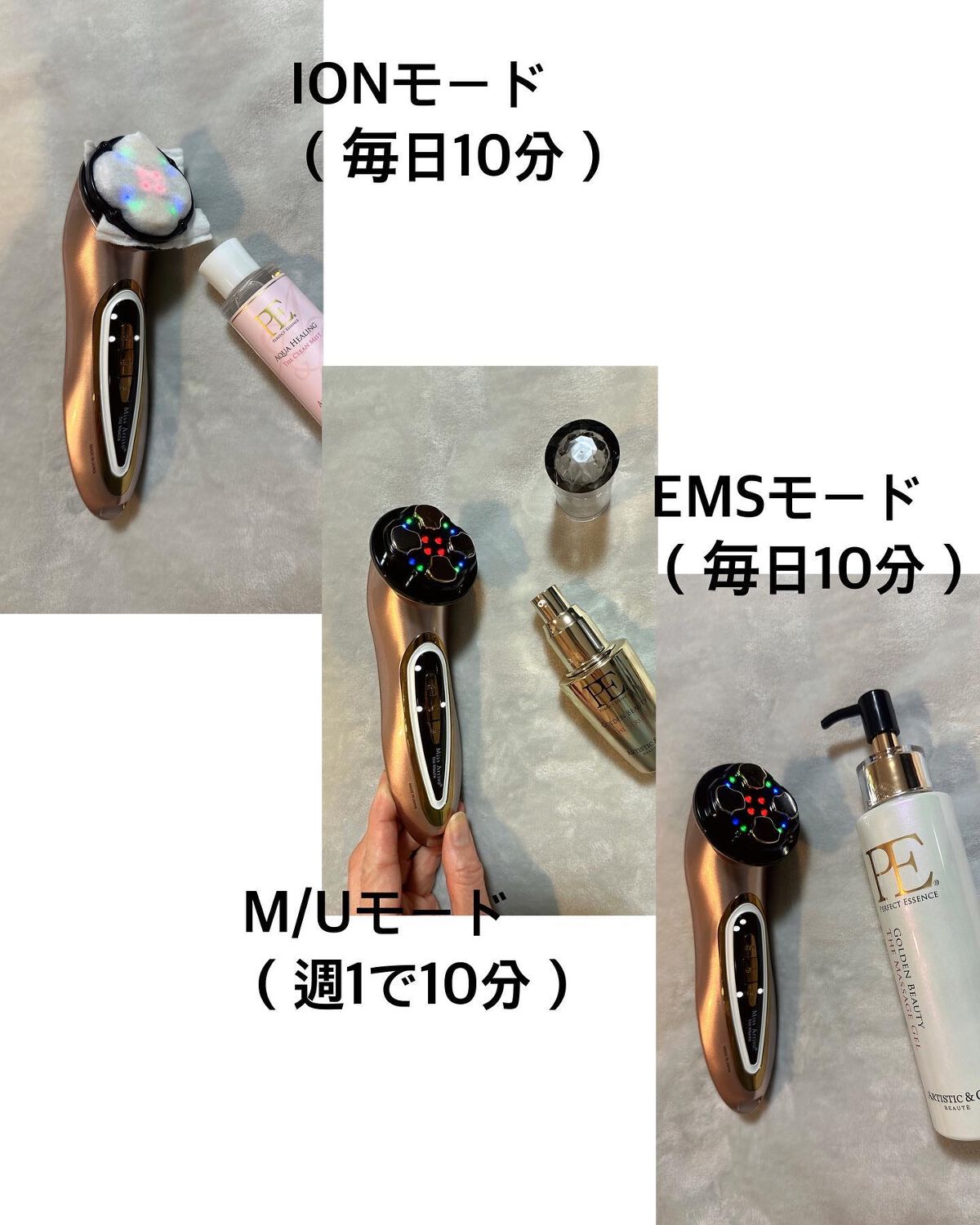 IONモードコットンをセットして肌に滑らせると、コットンに汚れがつくこともあって洗顔してても汚れ落ちてないんだなと思いました落としきれてない汚れをしっかり落としてくれる感じでした! M/Uモード一緒に付いてきた同じシリーズの美容液を使いました伸びの良いテクスチャーで、楽に肌の上を滑らせられました肌がじんわり温かくなる感じと引き締めてくれる感じの両方があって心地良かったです! EMSモード思ったよりパワーがあって、表情筋がケアできてるなと感じました肉をぐいぐいしてくれる感じ!優しすぎるのは物足りない!という人にぴったりだと思います✨むくみやすいタイプなのですが、普段より引き締まった感がありました!