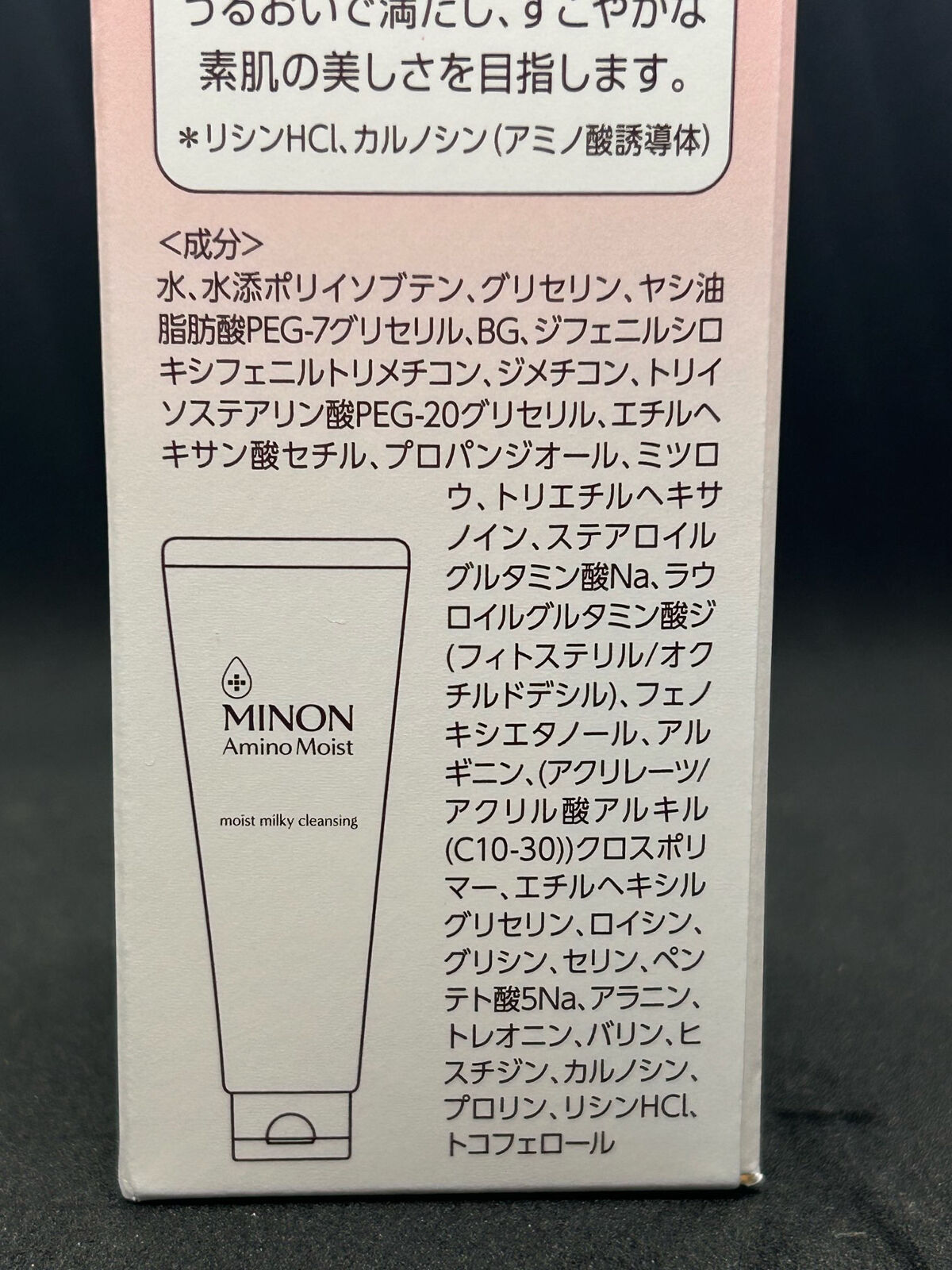 - <ミノン アミノモイスト モイストミルキィ クレンジング> 水、水添ポリイソブテン、グリセリン、ヤシ油脂肪酸PEG-7グリセリル、BG、ジフェニルシロキシフェニルトリメチコン、ジメチコン、トリイソステアリン酸PEG-20グリセリル、エチルヘキサン酸セチル、プロパンジオール、ミツロウ、トリエチルヘキサノイン、ステアロイルグルタミン酸Na、ラウロイルグルタミン酸ジ(フィトステリル/オクチルドデシル)、フェノキシエタノール、アルギニン、(アクリレーツ/アクリル酸アルキル(C10-30))クロスポリマー、エチルヘキシルグリセリン、ロイシン、グリシン、セリン、ペンテト酸5Na、アラニン、トレオニン、バリン、ヒスチジン、カルノシン、プロリン、リシンHCl、トコフェロール
