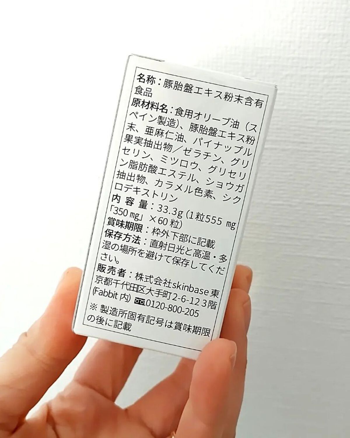 - 食用オリーブ油、豚胎盤エキス粉末、亜麻仁油、パイナップル果実抽出物、ゼラチン、グリセリン、ミツロウ、グリセリン脂肪酸エステル、ショウガ抽出物、カラメル色素、シクロデキストリン