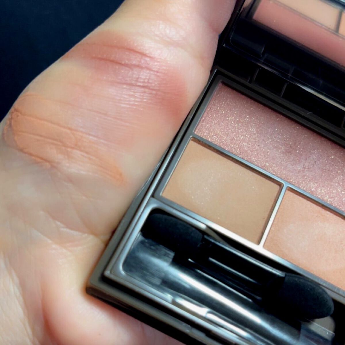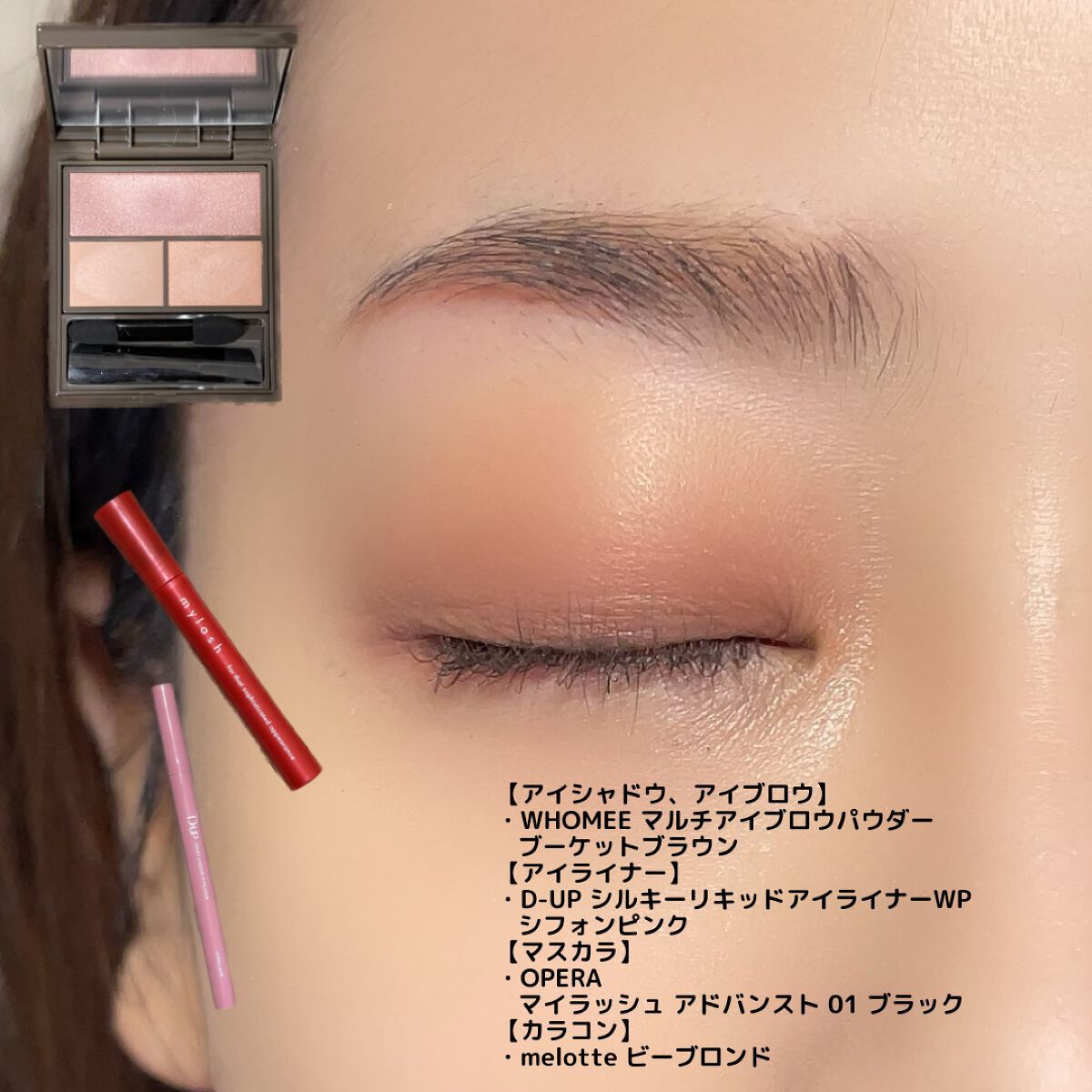 アイブロウとアイシャドウがこれ1個で完成 持ち運びに便利ですし荷物も減らせるのありがたいですね 見た目は明るいのですが塗ってみると使いやすかったです 気に入りすぎて毎日使いです。 大人も使いやすいピンクブラウン 私はWHOMEEの単色のラメと重ねたりして使ってます