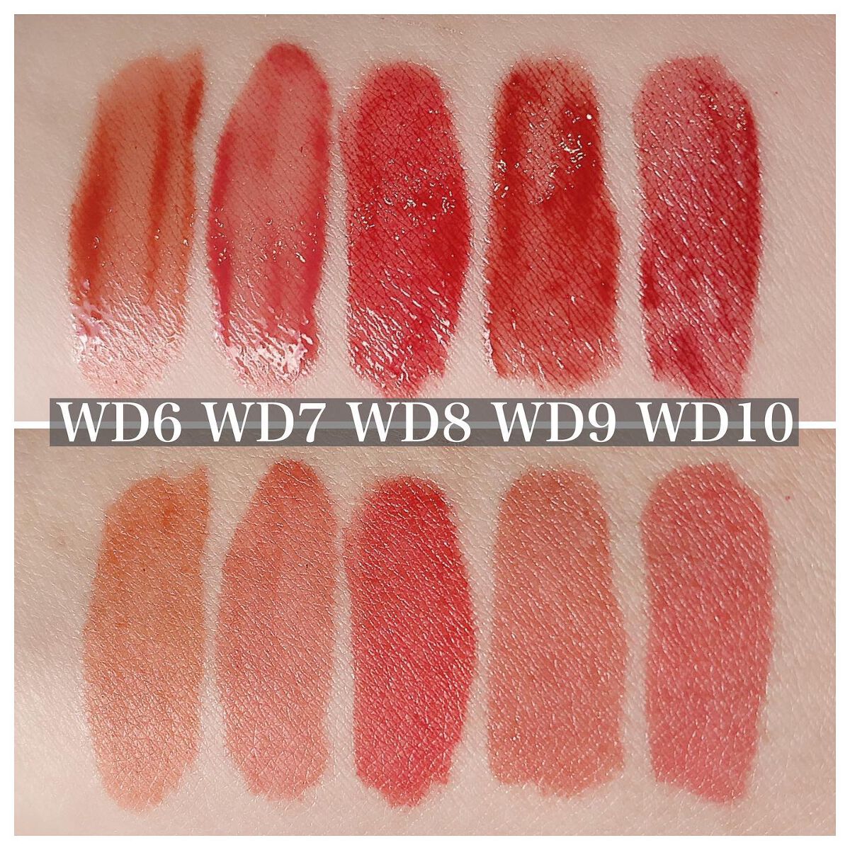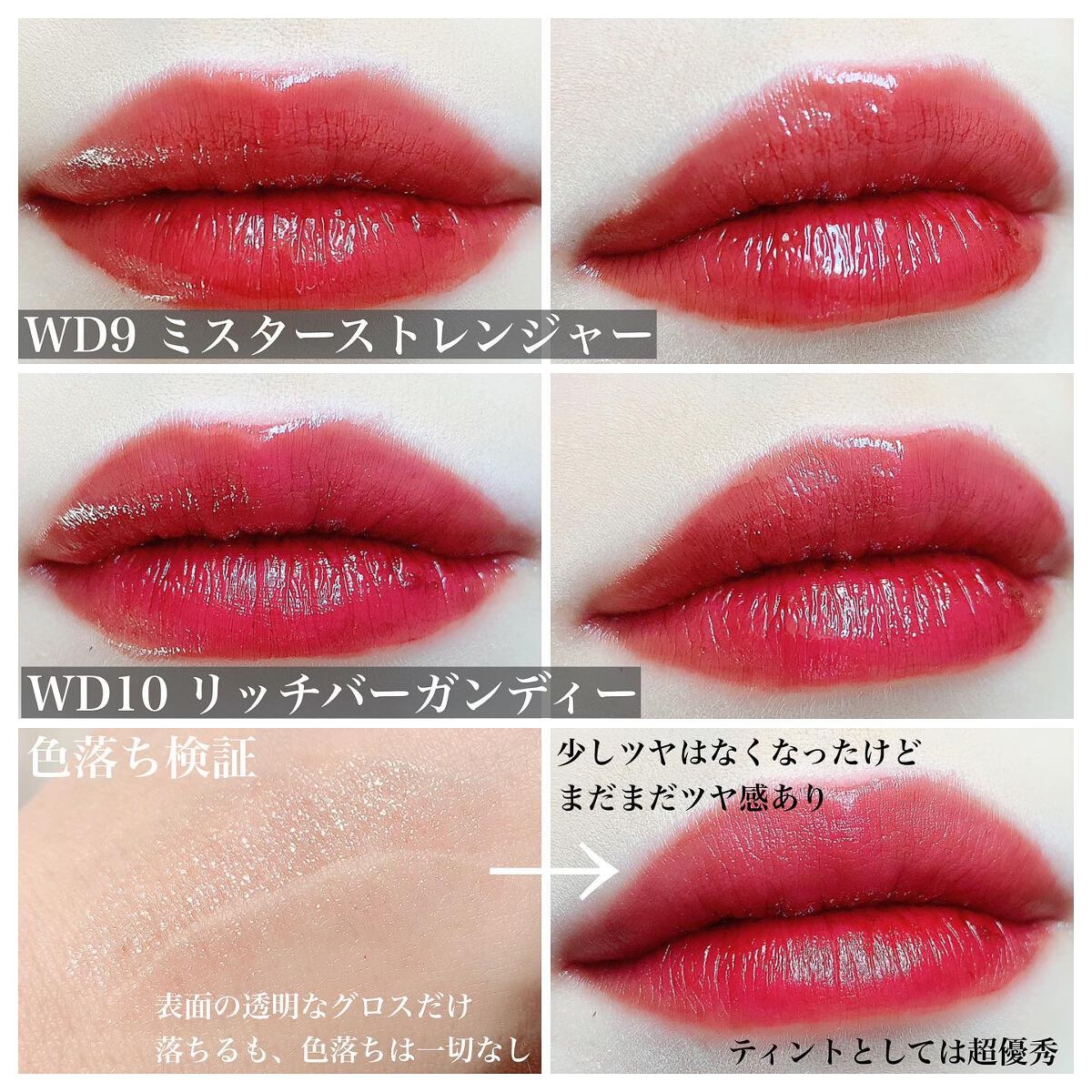 - <WD2 ビトゥン ローズ> 水、ジフェニルジメチコン、リンゴ酸ジイソステアリル、ビスジグリセリルポリアシルアジペート-2、水添ポリイソブテン、ジグリセリン、DPG、セチルPEG/PPG-10/1ジメチコン、イソステアリン酸ソルビタン、ポリソルベート60、ペンチレングリコール、オクチルドデカノール、セテアレス-20、(アクリル酸ヒドロキシエチル/アクリロイルジメチルタウリンNa)コポリマー、スクワラン、フェノキシエタノール、ポリグリセリン-3、ステビオシド、香料、エチルヘキシルグリセリン、グリセリン、シア脂、ツバキ種子油、トリ(カプリル酸/カプリン酸)グリセリル、アルガニアスピノサ核油、ホホバ種子油、アーモンド油、アンズ核油、月見草油、オリーブ果実油、テトラ(ジ-t-ブチルヒドロキシヒドロケイヒ酸)ペンタエリスリチル、カニナバラ果実エキス、マンゴー果実エキス、赤104(1)、赤227、黄5、青1 <WD3 ピンク ヘイズ> 水、ジフェニルジメチコン、リンゴ酸ジイソステアリル、ビスジグリセリルポリアシルアジペート-2、水添ポリイソブテン、ジグリセリン、DPG、セチルPEG/PPG-10/1ジメチコン、イソステアリン酸ソルビタン、ポリソルベート60、ペンチレングリコール、オクチルドデカノール、セテアレス-20、(アクリル酸ヒドロキシエチル/アクリロイルジメチルタウリンNa)コポリマー、スクワラン、フェノキシエタノール、ポリグリセリン-3、ステビオシド、香料、エチルヘキシルグリセリン、グリセリン、水酸化Al、ポリアクリル酸アンモニウム、BG、アルガニアスピノサ核油、シア脂、ツバキ種子油、トリ(カプリル酸/カプリン酸)グリセリル、アーモンド油、アンズ核油、ホホバ種子油、月見草油、オリーブ果実油、テトラ(ジ-t-ブチルヒドロキシヒドロケイヒ酸)ペンタエリスリチル、マンゴー果実エキス、カニナバラ果実エキス、酸化チタン、赤104(1)、赤227、黄5、青1 <WD4 オールウェイズ ヤング> 水、ジフェニルジメチコン、リンゴ酸ジイソステアリル、ビスジグリセリルポリアシルアジペート-2、水添ポリイソブテン、ジグリセリン、DPG、セチルPEG/PPG-10/1ジメチコン、イソステアリン酸ソルビタン、ポリソルベート60、ペンチレングリコール、オクチルドデカノール、セテアレス-20、(アクリル酸ヒドロキシエチル/アクリロイルジメチルタウリンNa)コポリマー、スクワラン、フェノキシエタノール、ポリグリセリン-3、ステビオシド、香料、エチルヘキシルグリセリン、グリセリン、シア脂、ツバキ種子油、トリ(カプリル酸/カプリン酸)グリセリル、アルガニアスピノサ核油、ホホバ種子油、アーモンド油、アンズ核油、月見草油、オリーブ果実油、テトラ(ジ-t-ブチルヒドロキシヒドロケイヒ酸)ペンタエリスリチル、カニナバラ果実エキス、マンゴー果実エキス、赤104(1)、赤227、黄5、青1 <WD6 クラッシュド パンプキン> 水、水添ポリイソブテン、リンゴ酸ジイソステアリル、ビスジグリセリルポリアシルアジペート-2、ジフェニルシロキシフェニルトリメチコン、ジフェニルジメチコン、ポリグリセリン-3、オクチルドデカノール、ポリソルベート60、セチルPEG/PPG-10/1ジメチコン、ラウリン酸ポリグリセリル-10、ペンチレングリコール、1,2-ヘキサンジオール、(アクリル酸ヒドロキシエチル/アクリロイルジメチルタウリンNa)コポリマー、PEG-60水添ヒマシ油、セテアリルアルコール、スクワラン、キシリトール、エチルヘキシルグリセリン、香料、ポリアクリル酸アンモニウム、イソステアリン酸ソルビタン、水酸化Al、フェノキシエタノール、BG、トコフェロール、酸化チタン、酸化鉄、赤227、黄4、黄5、青1 <WD8 ビンテージ カラント> 水、水添ポリイソブテン、リンゴ酸ジイソステアリル、ビスジグリセリルポリアシルアジペート-2、ジフェニルシロキシフェニルトリメチコン、ジフェニルジメチコン、オクチルドデカノール、ポリグリセリン-3、ポリソルベート60、セチルPEG/PPG-10/1ジメチコン、ラウリン酸ポリグリセリル-10、1,2-ヘキサンジオール、ペンチレングリコール、(アクリル酸ヒドロキシエチル/アクリロイルジメチルタウリンNa)コポリマー、PEG-60水添ヒマシ油、セテアリルアルコール、スクワラン、キシリトール、エチルヘキシルグリセリン、香料、イソステアリン酸ソルビタン、トコフェロール、赤104(1)、赤227、黄5、青1 <WD9 ミスター ストレンジャー> 水、水添ポリイソブテン、リンゴ酸ジイソステアリル、ビスジグリセリルポリアシルアジペート-2、ジフェニルシロキシフェニルトリメチコン、ジフェニルジメチコン、オクチルドデカノール、ポリグリセリン-3、ポリソルベート60、セチルPEG/PPG-10/1ジメチコン、ラウリン酸ポリグリセリル-10、1,2-ヘキサンジオール、ペンチレングリコール、(アクリル酸ヒドロキシエチル/アクリロイルジメチルタウリンNa)コポリマー、セテアリルアルコール、PEG-60水添ヒマシ油、スクワラン、キシリトール、エチルヘキシルグリセリン、香料、イソステアリン酸ソルビタン、水酸化Al、ポ
