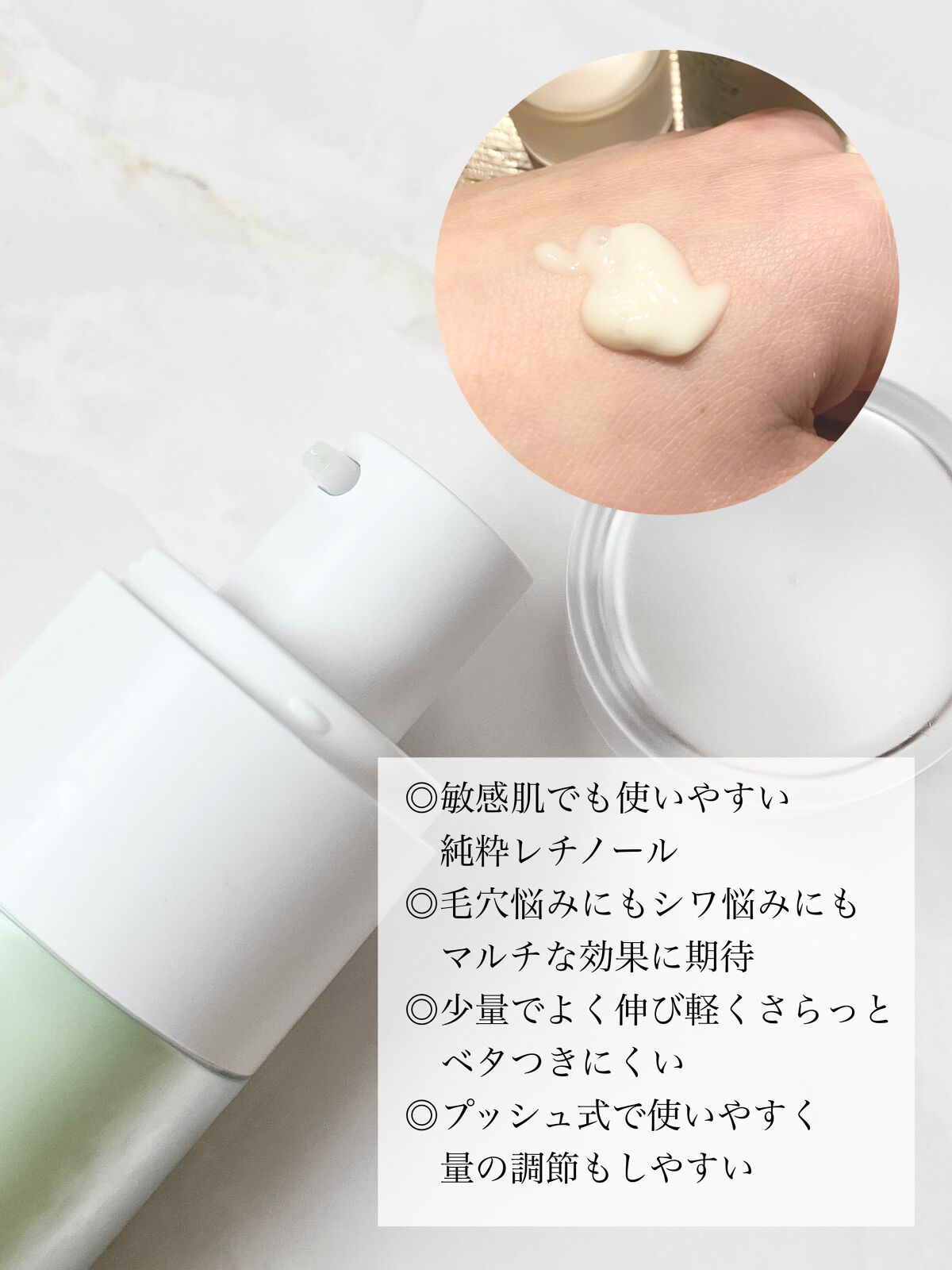 - こだわり成分配合◎パッケージにもこだわりをプラス♪ ●パッケージのポイント! エアレス容器でレチノール成分*を守り、鮮度の高い成分をそのまま肌へ届けます。 心地よく馴染み肌のキメを整える - 水分たっぷりの使用感でべたつきにくい! - しっとり肌の角質層隅々まで馴染み肌のキメが整った美肌に導いてくれます。 *整肌成分 使用方法 ◎ STEP1. エンドウ豆ほどに手に取り、気になる部分や顔全体に塗り広げます。