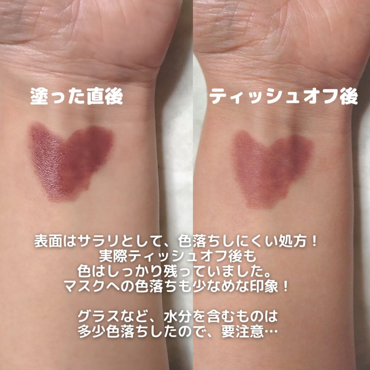 - ◆ほんのりツヤ仕込みのソフトマット質感 マットな質感の奥に、ほんのりツヤを仕込むことでベタっと見せず、自然になじんで抜け感のある仕上がりを叶えます。 ◆するりと伸びてなめらかに色がのる 見たまま発色 なめらかなつけ心地で唇にフィットし、縦ジワが目立たず、きれいに発色します。 ◆水分を密閉キープ!マットなのにしっとり乾燥しにくい マットなのに乾燥しにくく、しっとりうるおいを保ちます。 マットリップのイメージを変えるテクスチャーで、肌をきれいに見せます。 ◆縦ジワカバー効果 【光拡散パウダー配合】 ◆表面はさらりとして色落ちしにくい ◆しっとりうるおう美容液成分配合 美容液成分:ヒアルロン酸・コラーゲン・ローヤルゼリーエキス・カミツレエキス(すべて保湿成分) ◆皮フ刺激テスト済み※1 ※1 すべての方に皮フ刺激が起こらないというわけではありません。