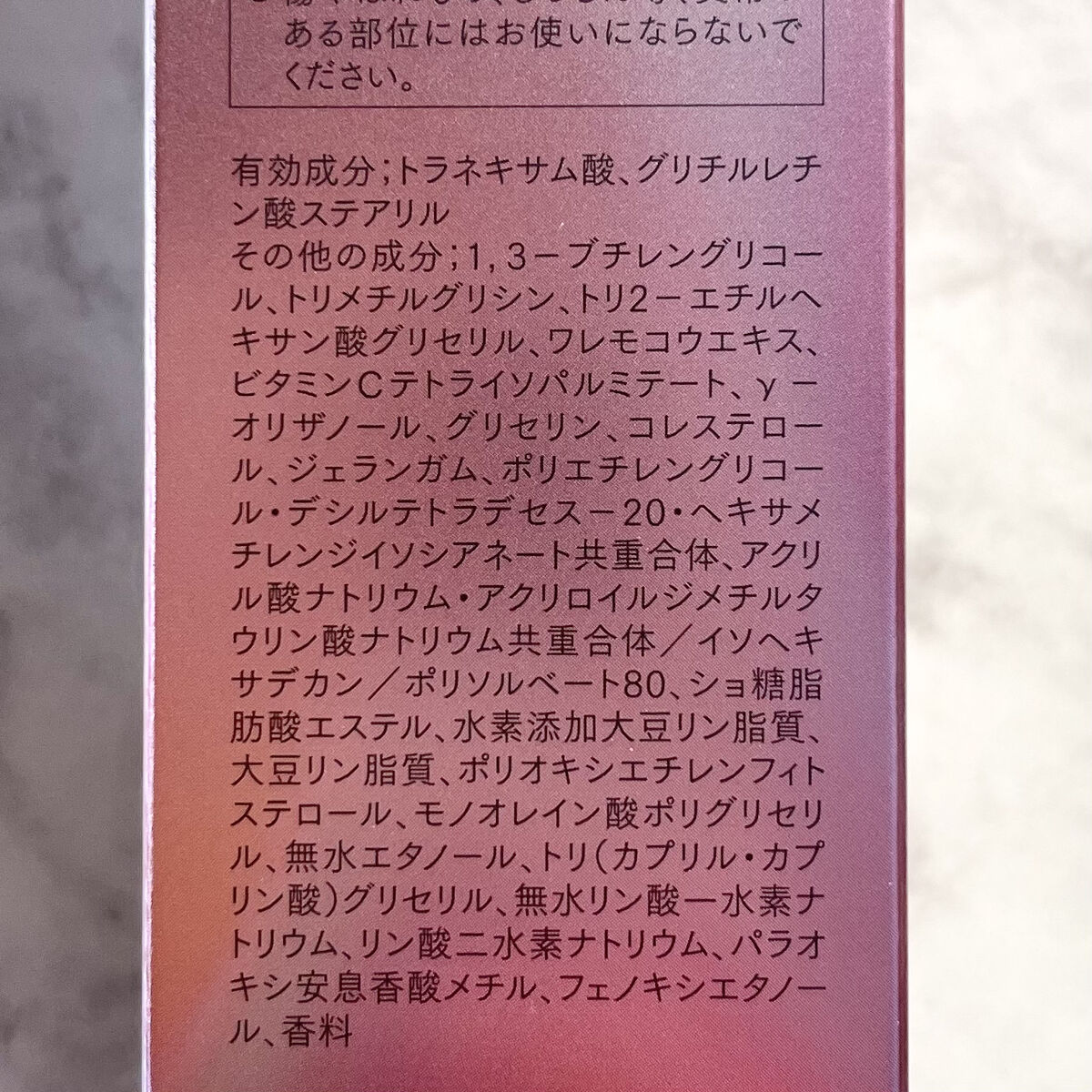 - <本体> 有効成分 トラネキサム酸、グリチルレチン酸ステアリル その他の成分 1,3-ブチレングリコール、トリメチルグリシン、トリ2-エチルヘキサン酸グリセリル、ワレモコウエキス、ビタミンCテトライソパルミテート、γ-オリザノール、グリセリン、コレステロール、ジェランガム、ポリエチレングリコール・デシルテトラデセス-20・ヘキサメチレンジイソシアネート共重合体、アクリル酸ナトリウム・アクリロイルジメチルタウリン酸ナトリウム共重合体/イソヘキサデカン/ポリソルベート80、ショ糖脂肪酸エステル、水素添加大豆リン脂質、大豆リン脂質、ポリオキシエチレンフィトステロール、モノオレイン酸ポリグリセリル、無水エタノール、トリ(カプリル・カプリン酸)グリセリル、無水リン酸一水素ナトリウム、リン酸二水素ナトリウム、パラオキシ安息香酸メチル、フェノキシエタノール、香料 <レフィル> 有効成分 トラネキサム酸、グリチルレチン酸ステアリル その他の成分 1,3-ブチレングリコール、トリメチルグリシン、トリ2-エチルヘキサン酸グリセリル、ワレモコウエキス、ビタミンCテトライソパルミテート、γ-オリザノール、グリセリン、コレステロール、ジェランガム、ポリエチレングリコール・デシルテトラデセス-20・ヘキサメチレンジイソシアネート共重合体、アクリル酸ナトリウム・アクリロイルジメチルタウリン酸ナトリウム共重合体/イソヘキサデカン/ポリソルベート80、ショ糖脂肪酸エステル、水素添加大豆リン脂質、大豆リン脂質、ポリオキシエチレンフィトステロール、モノオレイン酸ポリグリセリル、無水エタノール、トリ(カプリル・カプリン酸)グリセリル、無水リン酸一水素ナトリウム、リン酸二水素ナトリウム、パラオキシ安息香酸メチル、フェノキシエタノール、香料 <トライアル> 有効成分 トラネキサム酸、グリチルレチン酸ステアリル その他の成分 1,3-ブチレングリコール、トリメチルグリシン、トリ2-エチルヘキサン酸グリセリル、ワレモコウエキス、ビタミンCテトライソパルミテート、γ-オリザノール、グリセリン、コレステロール、ジェランガム、ポリエチレングリコール・デシルテトラデセス-20・ヘキサメチレンジイソシアネート共重合体、アクリル酸ナトリウム・アクリロイルジメチルタウリン酸ナトリウム共重合体/イソヘキサデカン/ポリソルベート80、ショ糖脂肪酸エステル、水素添加大豆リン脂質、大豆リン脂質、ポリオキシエチレンフィトステロール、モノオレイン酸ポリグリセリル、無水エタノール、トリ(カプリル・カプリン酸)グリセリル、無水リン酸一水素ナトリウム、リン酸二水素ナトリウム、パラオキシ安息香酸メチル、フェノキシエタノール、香料