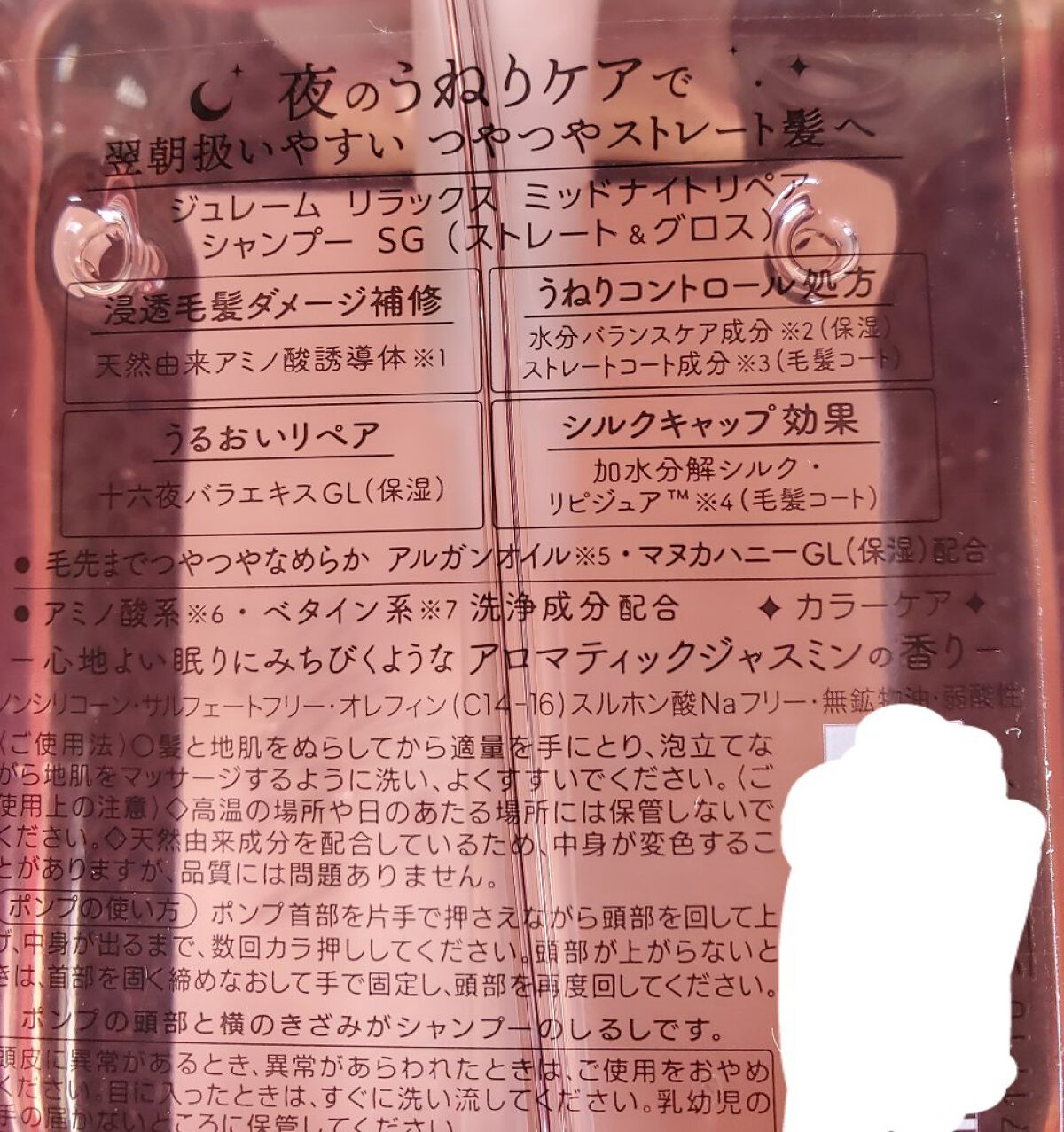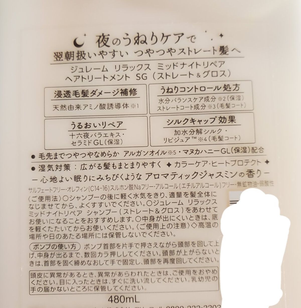 - ※2024年9月末以降数量限定で詰め替え増量商品を販売致します。尚、なくなり次第終了とさせていただき、これに係る商品の返品・交換等は承っておりません。 商品はお選びいただくことはできませんので何卒ご了承ください。 夜のうねりケアで扱いやすいストレート髪へみちびく 「ジュレーム リラックス」 ●うねりの原因に着目し、髪の内側からも外側からもアプローチ シルクキャップ効果で、素直にまとまる髪に ●つやつやストレート髪へみちびくシャンプー&トリートメント 髪や地肌をいたわる、やさしい使い心地 ノンシリコーン(シャンプーのみ)・サルフェートフリー・オレフィン(C14-16)スルホン酸Naフリー ●眠る前のリラックスタイムに使いたい アロマティックジャスミンの香り