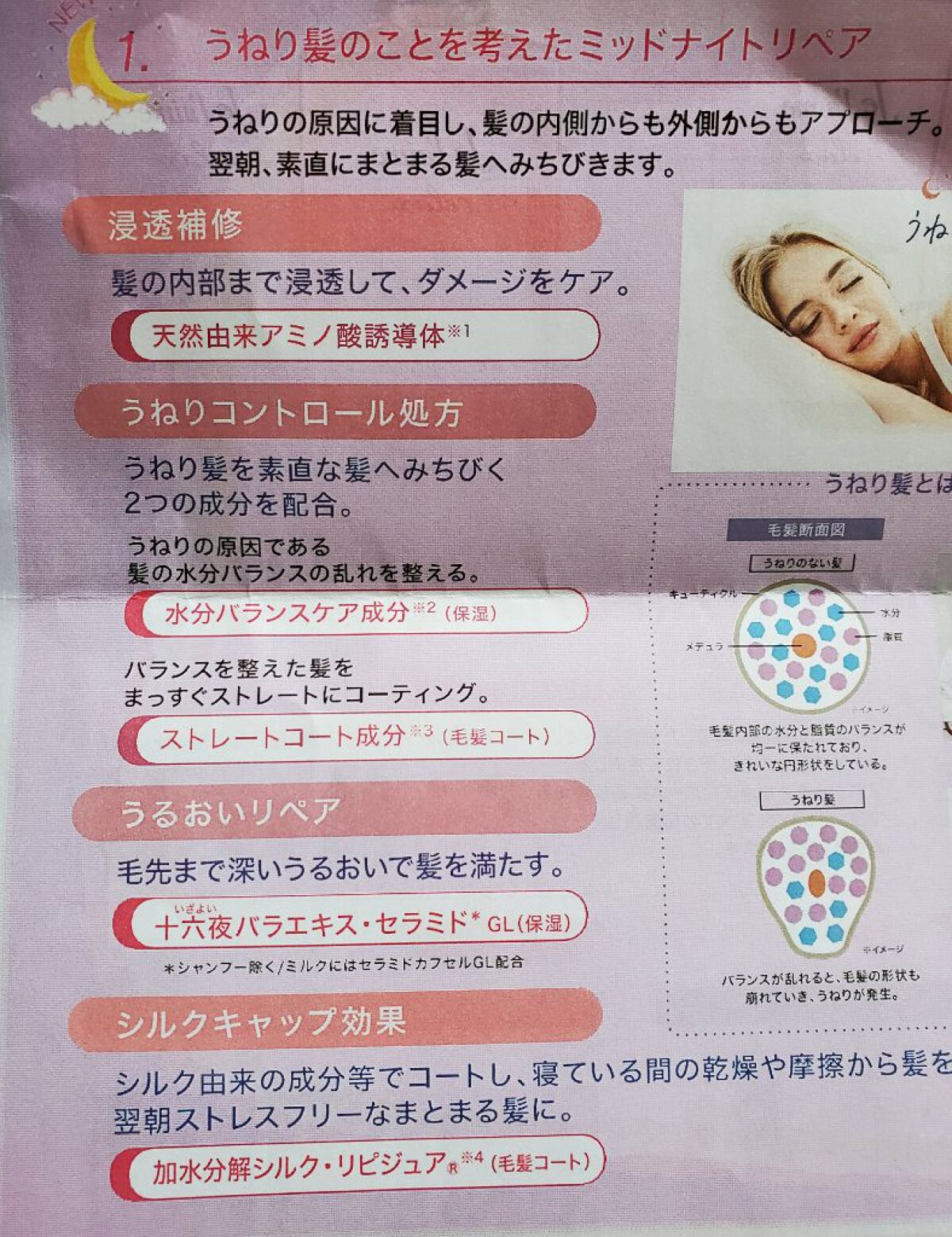 - <シャンプー本体 480ml> 水、ココイルグルタミン酸TEA、ラウロイルメチルアラニンTEA、ココイルグリシンK、コカミドプロピルベタイン、ラウリルベタイン、ココイルメチルタウリンNa、PPG-2コカミド、エタノール、グリセリン、アルガニアスピノサ核油、イザヨイバラエキス、グリコシルトレハロース、テアニン、トコフェロール、ハチミツ、ポリクオタニウム-51、加水分解シルク、BG、EDTA-2Na、イソステアリン酸PEG-50水添ヒマシ油、クエン酸、ジラウリン酸PEG-75、ジラウロイルグルタミン酸リシンNa、ポリクオタニウム-10、ポリクオタニウム-7、塩化Na、加水分解水添デンプン、炭酸水素Na、フェノキシエタノール、メチルパラベン、安息香酸Na、香料 <ヘアトリートメント本体 480ml> 水、ジメチコン、エチルヘキサン酸セチル、セテアリルアルコール、ステアルトリモニウムクロリド、ベヘニルアルコール、アモジメチコン、グリセリン、ミリスチン酸イソプロピル、アルガニアスピノサ核油、イザヨイバラエキス、テアニン、ハチミツ、ポリクオタニウム-51、加水分解シルク、BG、BHT、EDTA-2Na、PEG-40水添ヒマシ油、PEG-45M、イソステアリン酸、イソプロパノール、クエン酸Na、ジステアリルジモニウムクロリド、ジラウロイルグルタミン酸リシンNa、ステアリン酸グリセリル、セラミドNG、ポリクオタニウム-7、水酸化Al、水添パーム油、水添ヤシ油、フェノキシエタノール、メチルパラベン、安息香酸Na、香料 <シャンプー 詰替 340ml> 水、ココイルグルタミン酸TEA、ラウロイルメチルアラニンTEA、ココイルグリシンK、コカミドプロピルベタイン、ラウリルベタイン、ココイルメチルタウリンNa、PPG-2コカミド、エタノール、グリセリン、アルガニアスピノサ核油、イザヨイバラエキス、グリコシルトレハロース、テアニン、トコフェロール、ハチミツ、ポリクオタニウム-51、加水分解シルク、BG、EDTA-2Na、イソステアリン酸PEG-50水添ヒマシ油、クエン酸、ジラウリン酸PEG-75、ジラウロイルグルタミン酸リシンNa、ポリクオタニウム-10、ポリクオタニウム-7、塩化Na、加水分解水添デンプン、炭酸水素Na、フェノキシエタノール、メチルパラベン、安息香酸Na、香料 <ヘアトリートメント詰替 340ml> 水、ジメチコン、エチルヘキサン酸セチル、セテアリルアルコール、ステアルトリモニウムクロリド、ベヘニルアルコール、アモジメチコン、グリセリン、ミリスチン酸イソプロピル、アルガニアスピノサ核油、イザヨイバラエキス、テアニン、ハチミツ、ポリクオタニウム-51、加水分解シルク、BG、BHT、EDTA-2Na、PEG-40水添ヒマシ油、PEG-45M、イソステアリン酸、イソプロパノール、クエン酸Na、ジステアリルジモニウムクロリド、ジラウロイルグルタミン酸リシンNa、ステアリン酸グリセリル、セラミドNG、ポリクオタニウム-7、水酸化Al、水添パーム油、水添ヤシ油、フェノキシエタノール、メチルパラベン、安息香酸Na、香料 <シャンプー 詰替 680ml> 水、ココイルグルタミン酸TEA、ラウロイルメチルアラニンTEA、ココイルグリシンK、コカミドプロピルベタイン、ラウリルベタイン、ココイルメチルタウリンNa、PPG-2コカミド、エタノール、グリセリン、アルガニアスピノサ核油、イザヨイバラエキス、グリコシルトレハロース、テアニン、トコフェロール、ハチミツ、ポリクオタニウム-51、加水分解シルク、BG、EDTA-2Na、イソステアリン酸PEG-50水添ヒマシ油、クエン酸、ジラウリン酸PEG-75、ジラウロイルグルタミン酸リシンNa、ポリクオタニウム-10、ポリクオタニウム-7、塩化Na、加水分解水添デンプン、炭酸水素Na、フェノキシエタノール、メチルパラベン、安息香酸Na、香料 <ヘアトリートメント詰替 680ml> 水、ジメチコン、エチルヘキサン酸セチル、セテアリルアルコール、ステアルトリモニウムクロリド、ベヘニルアルコール、アモジメチコン、グリセリン、ミリスチン酸イソプロピル、アルガニアスピノサ核油、イザヨイバラエキス、テアニン、ハチミツ、ポリクオタニウム-51、加水分解シルク、BG、BHT、EDTA-2Na、PEG-40水添ヒマシ油、PEG-45M、イソステアリン酸、イソプロパノール、クエン酸Na、ジステアリルジモニウムクロリド、ジラウロイルグルタミン酸リシンNa、ステアリン酸グリセリル、セラミドNG、ポリクオタニウム-7、水酸化Al、水添パーム油、水添ヤシ油、フェノキシエタノール、メチルパラベン、安息香酸Na、香料