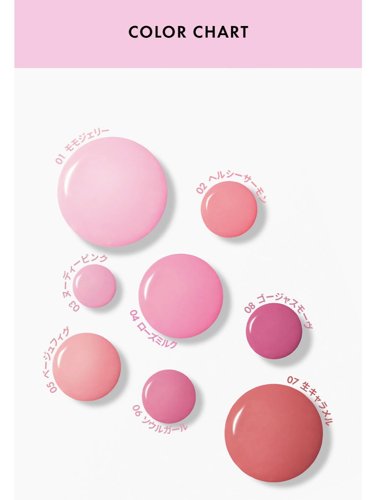 - <01 モモジェリー> Water、Diphenyl Dimethicone、Diisostearyl Malate、Bis-Diglyceryl Polyacyladipate-2、Hydrogenated Polyisobutene、Bis-Behenyl/Isostearyl/Phytosteryl Dimer Dilinoleyl Dimer Dilinoleate、Cetyl PEG/PPG-10/1 Dimethicone、Diglycerin、Hydrogenated Polydecene、Dipropylene Glycol、Polysorbate 60、Sorbitan Isostearate、Hydroxyethyl Acrylate/Sodium Acryloyldimethyl Taurate Copolymer、Pentylene Glycol、Squalane、Titanium Dioxide (CI 77891)、Ethylene/Propylene Copolymer、Ceteareth-20、Phenoxyethanol、Polyglycerin-3、Yellow 5 (CI 19140)、Red 33 (CI 17200)、Fragrance、Ethylhexylglycerin、Glycerin、Aluminum Hydroxide、Ammonium Polyacrylate、Yellow 6 (CI 15985)、Butylene Glycol、Blue 1 (CI 42090)、Tocopheryl Acetate、Prunus Persica (Peach) Fruit Extract、1,2-Hexanediol、Sodium Hyaluronate、Hydroxypropyltrimonium Hyaluronate、Sodium Acetylated Hyaluronate、Hydrolyzed Hyaluronic acid、Hyaluronic Acid、Sodium Hyaluronate Crosspolymer、Hydrolyzed Sodium Hyaluronate、Potassium Hyaluronate <02 ヘルシーサーモン> Water、Diphenyl Dimethicone、Diisostearyl Malate、Bis-Diglyceryl Polyacyladipate-2、Hydrogenated Polyisobutene、Bis-Behenyl/Isostearyl/Phytosteryl Dimer Dilinoleyl Dimer Dilinoleate、Cetyl PEG/PPG-10/1 Dimethicone、Diglycerin、Hydrogenated Polydecene、Dipropylene Glycol、Polysorbate 60、Sorbitan Isostearate、Hydroxyethyl Acrylate/Sodium Acryloyldimethyl Taurate Copolymer、Pentylene Glycol、Squalane、Ethylene/Propylene Copolymer、Ceteareth-20、Phenoxyethanol、Titanium Dioxide (CI 77891)、Polyglycerin-3、Yellow 6 (CI 15985)、Fragrance、Ethylhexylglycerin、Red 33 (CI 17200)、Glycerin、Red 28 (CI 45410)、Aluminum Hydroxide、Ammonium Polyacrylate、Yellow 5 (CI 19140)、Butylene Glycol、Tocopheryl Acetate、Blue 1 (CI 42090)、Prunus Persica (Peach) Fruit Extract、1,2-Hexanediol、Sodium Hyaluronate、Hydroxypropyltrimonium Hyaluronate、Sodium Acetylated Hyaluronate、Hydrolyzed Hyaluronic acid、Hyaluronic Acid、Sodium Hyaluronate Crosspolymer、Hydrolyzed Sodium Hyaluronate、Potassium Hyaluronate <03 ヌーディーピンク> Water、Diphenyl Dimethicone、Diisostearyl Malate、Bis-Diglyceryl Polyacyladipate-2、Hydrogenated Polyisobutene、Bis-Behenyl/Isostearyl/Phytosteryl Dimer Dilinoleyl Dimer Dilinoleate、Cetyl PEG/PPG-10/1 Dimethicone、Diglycerin、Hydrogenated Polydecene、Dipropylene Glycol、Polysorbate 60、Sorbitan Isostearate、Hydroxyethyl Acrylate/Sodium Acryloyldimethyl Taurate Copolymer、Pentylene Glycol、Squalane、Ethylene/Propylene Copolymer、Ceteareth-20、Titanium Dioxide (CI 77891)、Phenoxyethanol、Polyglycerin-3、Red 33 (CI 17200)、Yellow 5 (CI 19140)、Fragrance、Ethylhexylglycerin、Glycerin、Aluminum Hydroxide、Ammonium Polyacrylate、Butylene Glycol、Blue 1 (CI 42090)、Tocopheryl Acetate、Prunus Persica (Peach) Fruit Extract、1,2-Hexanediol、Sodium Hyaluronate、Hydroxypropyltrimonium Hyaluronate、Sodium Acetylated Hyaluronate、Hydrolyzed Hyaluronic acid、Hyaluronic Acid、Sodium Hyaluronate Crosspolymer、Hydrolyzed Sodium Hyaluronate、Potassium Hyaluronate <04 ローズミルク> Water、Diphenyl Dimethicone、Diisostearyl Malate、Bis-Diglyceryl Polyacyladipate-2、Hydrogenated Polyisobutene、Bis-Behenyl/Isostearyl/Phytosteryl Dimer Dilinoleyl Dimer Dilinoleate、Cetyl PEG/PPG-10/1 Dimethicone、Diglycerin、Hydrogenated Polydecene、Dipropylene Glycol、Polysorbate 60、Sorbitan Isostearate、Hydroxyethyl Acrylate/Sodium Acryloyldimethyl Taurate Copolymer、Pentylene Glycol、Squalane、Ethylene/Propylene Copolymer、Ceteareth-20、Titanium Dioxide (CI 77891)、Phenoxyethanol、Polyglycerin-3、Red 28 (CI 45410)、Yellow 6 (CI 15985)、Fragrance、Ethylhexylglycerin、Red 33 (CI 17200)、Glycerin、Aluminum Hydroxide、Ammonium Polyacrylate、Butylene Glycol、Blue 1 (CI 42090)、Tocopheryl Acetate、Prunus Persica (Peach) Fruit Extract、1,2-Hexanediol、Sodium Hyaluronate、Hydroxypropyltrimonium Hyaluronate、Sodium Acetylated Hyaluronate、Hydrolyzed Hyaluronic acid、Hyaluronic Acid、Sodium Hyaluronate Crosspolymer、Hydrolyzed Sodium Hyaluronate、Potassium Hyaluronate <05 ベージュフィグ> Water、Diphenyl Dimethicone、Diisostearyl Malate、Bis-Diglyceryl Polyacyladipate-2、Hydrogenated Polyisobutene、Bis-Behenyl/Isostearyl/Phytosteryl Dimer Dilinoleyl Dimer Dilinoleate、Cetyl PEG/PPG-10/1 Dimethicone、Diglycerin、Hydrogenated Polydecene、Dipropylene Glycol、Polysorbate 60、Sorbitan Isostearate、Hydroxyethyl Acrylate/Sodium Acryloyldimethyl Taurate Copolymer、Pentylene Glycol、Squalane、Titanium Dioxide (CI 77891)、Ethylene/Propylene Copolymer、Ceteareth-20、Phenoxyethanol、Polyglycerin-3、Yellow 5 (CI 19140)、Red 33 (CI 17200)、Fragrance、Ethylhexylglycerin、Yellow 6 (CI 15985)、Glycerin、Aluminum Hydroxide、Ammonium Polyacrylate、Butylene Glycol、Blue 1 (CI 42090)、Tocopheryl Acetate、Prunus Persica (Peach) Fruit Extract、1,2-Hexanediol、Sodium Hyaluronate、Hydroxypropyltrimonium Hyaluronate、Sodium Acetylated Hyaluronate、Hydrolyzed Hyaluronic acid、Hyaluronic Acid、Sodium Hyaluronate Crosspolymer、Hydrolyzed Sodium Hyaluronate、Potassium Hyaluronate <06 ソウルガール> Water、Diphenyl Dimethicone、Diisostearyl Malate、Bis-Diglyceryl Polyacyladipate-2、Hydrogenated Polyisobutene、Bis-Behenyl/Isostearyl/Phytosteryl Dimer Dilinoleyl Dimer Dilinoleate、Cetyl PEG/PPG-10/1 Dimethicone、Diglycerin、Hydrogenated Polydecene、Dipropylene Glycol、Polysorbate 60、Sorbitan Isostearate、Hydroxyethyl Acrylate/Sodium Acryloyldimethyl Taurate Copolymer、Pentylene Glycol、Squalane、Ethylene/Propylene Copolymer、Ceteareth-20、Titanium Dioxide (CI 77891)、Phenoxyethanol、Polyglycerin-3、Red 33 (CI 17200)、Yellow 6 (CI 15985)、Fragrance、Ethylhexylglycerin、Yellow 5 (CI 19140)、Glycerin、Aluminum Hydroxide、Ammonium Polyacrylate、Blue 1 (CI 42090)、Butylene Glycol、Tocopheryl Acetate