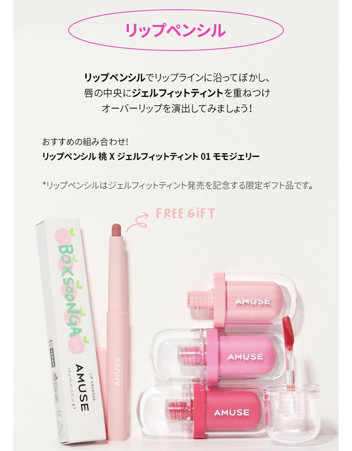 - 濃密なぷにゅっとジェリーが もっちり密着される 長時間持続のジェルフィットティント ☑ぷにゅっとジェリーがもっちり密着される長時間持続&新概念ジェルフィットテクスチャー* ☑8Shadesの透き通るぷにゅっとジェリー発色 ☑3重ツヤシステムで満たせれたぷにゅっとしたジェリーツヤ ☑ジェリーツヤ膜で保湿感ロック ☑手軽いサイズのNEW透明ティント&ぷにゅぷにゅジェリーデザイン ☑ヴィーガン処方 *)AMUSE内において