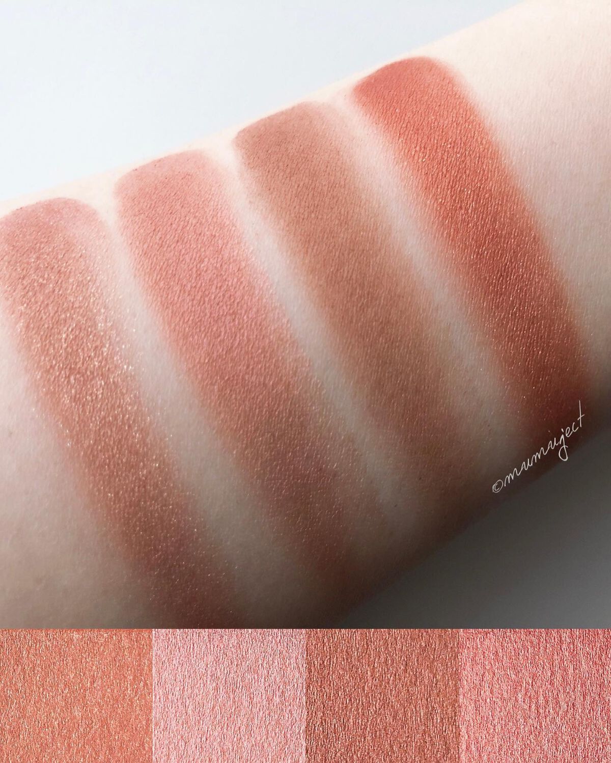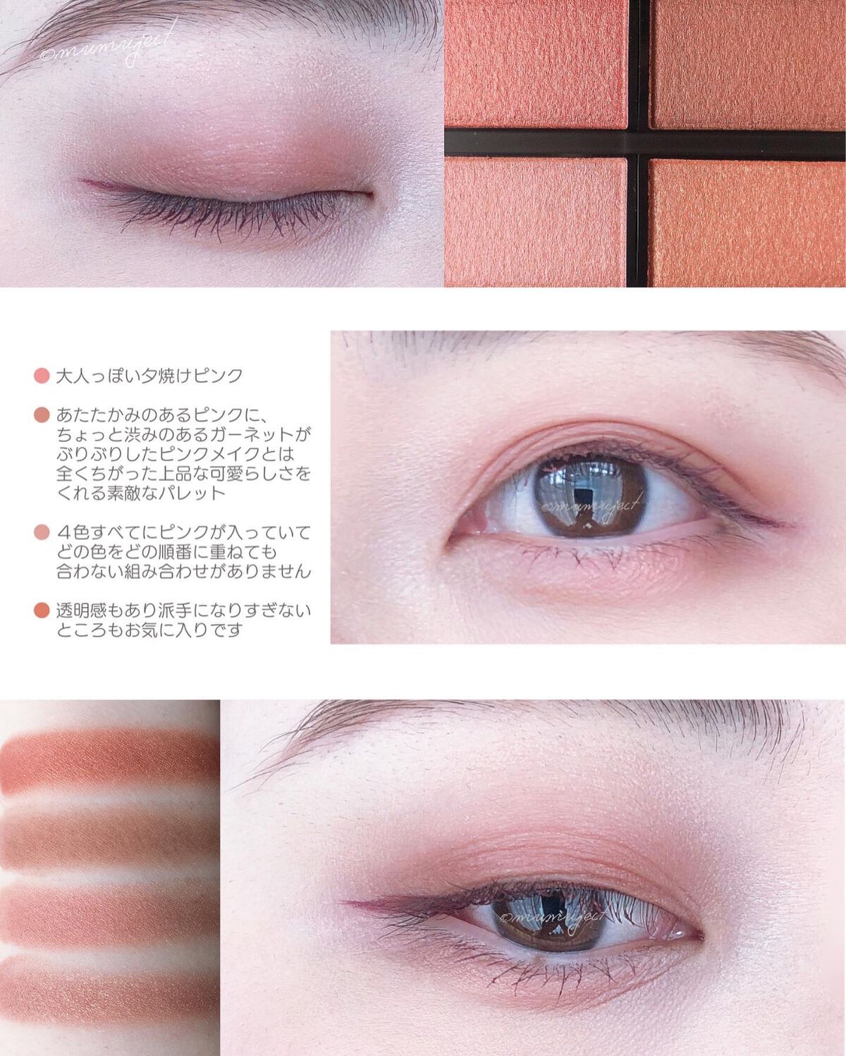 ゴールドとピンクを中心とした多色パール。 それらが交わってできる輝きと濡れ感が高貴な感じがして、使うたびに嬉しくなります。 深みと透明感が両立していて、そのニュアンスや空気感を存分に楽しむような、そんなパレットです。 4色を重ねていくにつれてアンニュイな雰囲気で満たされていきます。