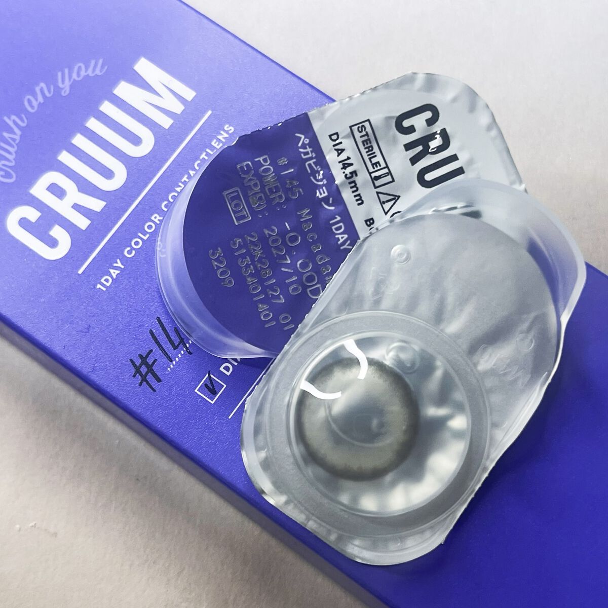 - cruum 忙しい女性にも最適な1DAY レンズケアも不要だから使用後も楽チン。 毎日取り換えるからいつも清潔に。 cruum UVカットプロテクト機能 年中降り注ぐ紫外線は肌だけでなく、 目にもダメージを与えます。 瞳に有害といわれている紫外線B波を 約95%、紫外線A波を約50%カット。 紫外線によるダメージから守ります。 cruum 含水率58%の高含水レンズ 含水率が高いと素材が柔らかくなるので、 眼に馴染みやすく付け心地が 柔らかくなります。 ※2025年10月10日〜パッケージデザインをカラーごとの個別パッケージからシリーズごとの統一パッケージへ変更。